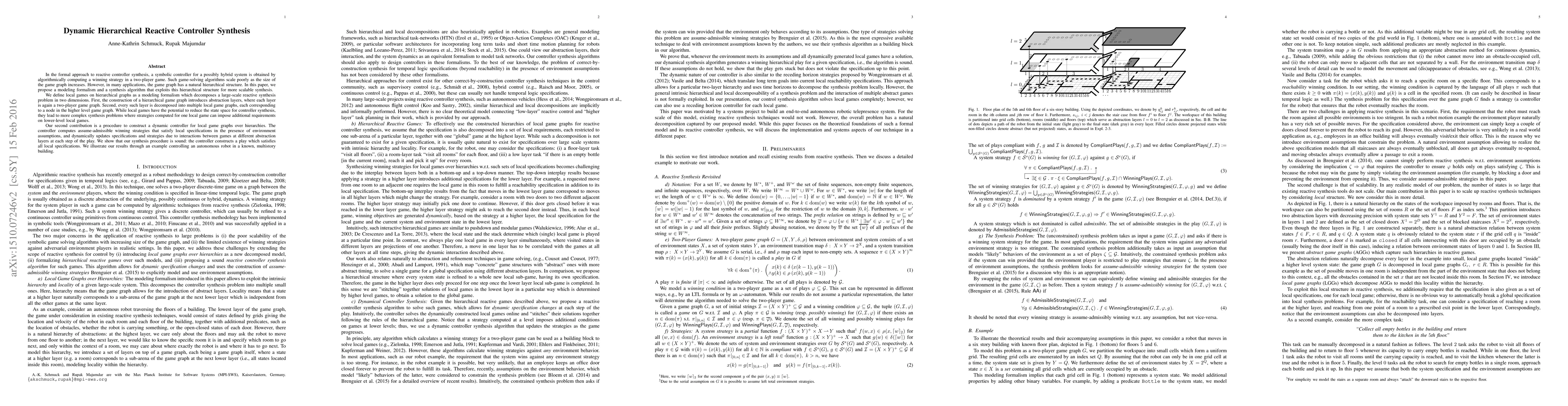 This paper proposes a hierarchical modeling formalism and synthesis algorithm to improve scalability in reactive controller synthesis for hybrid systems. It decomposes large-scale problems into local games on hierarchical graphs, dynamically updating strategies to satisfy local specifications across abstraction layers.