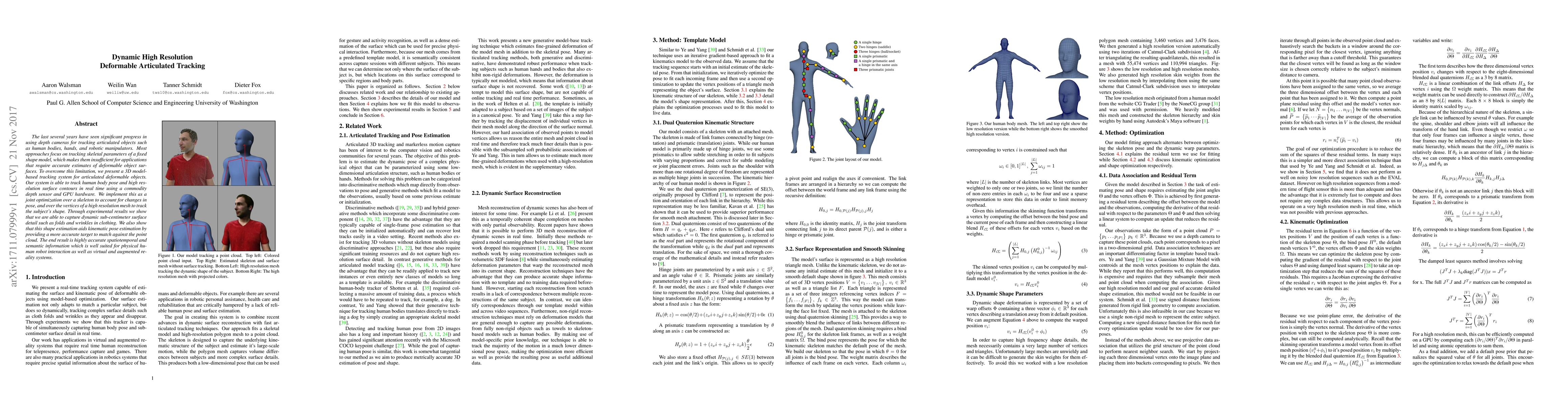 The research presents a 3D model-based tracking system for articulated deformable objects using a depth sensor and GPU hardware. It optimizes jointly over a skeleton for pose changes and over high-resolution mesh vertices for shape tracking, enabling real-time capture of dynamic sub-centimeter surface details.