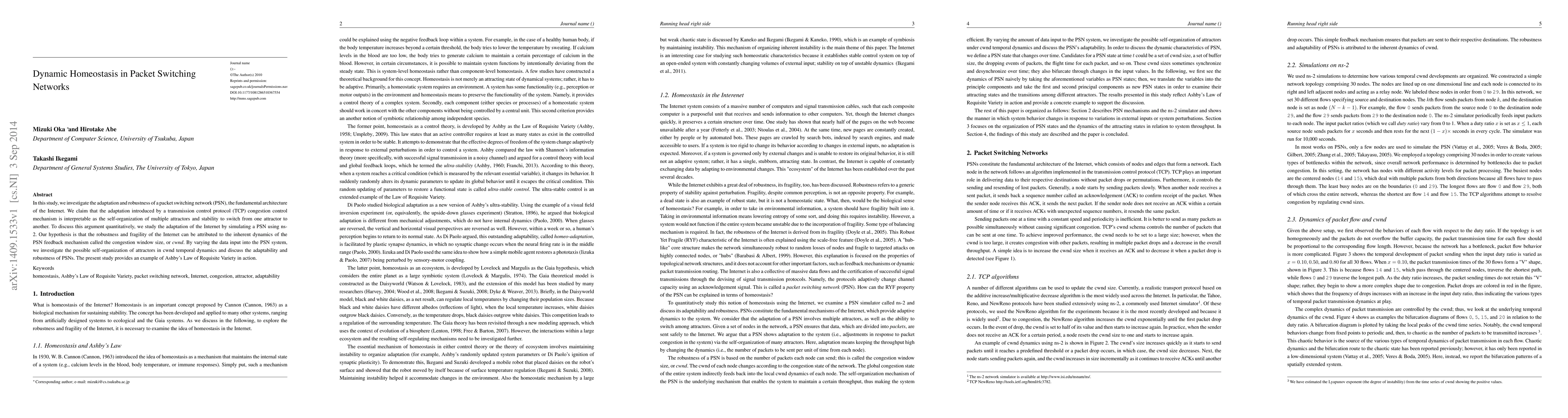 This study explores the self-organization and adaptability of packet switching networks (PSN) through TCP congestion control, interpreting it as a dynamic homeostasis of multiple attractors. Using ns-2 simulations, the research investigates the robustness of the Internet's PSN architecture, attributing its dynamic stability to the congestion window size (\textit{cwnd}) feedback mechanism.