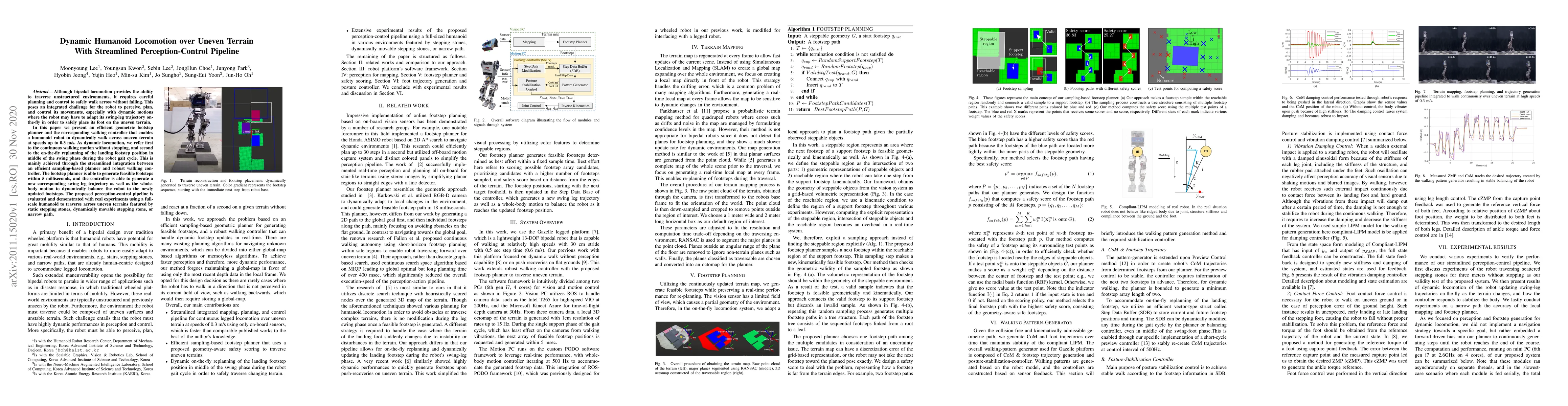 This paper presents an efficient perception-control pipeline for a humanoid robot to dynamically navigate uneven terrain at speeds up to 0.3 m/s, integrating a rapid geometric footstep planner with a robust walking controller for real-time adaptation and balance. Experiments demonstrate successful traversal across various terrain challenges.