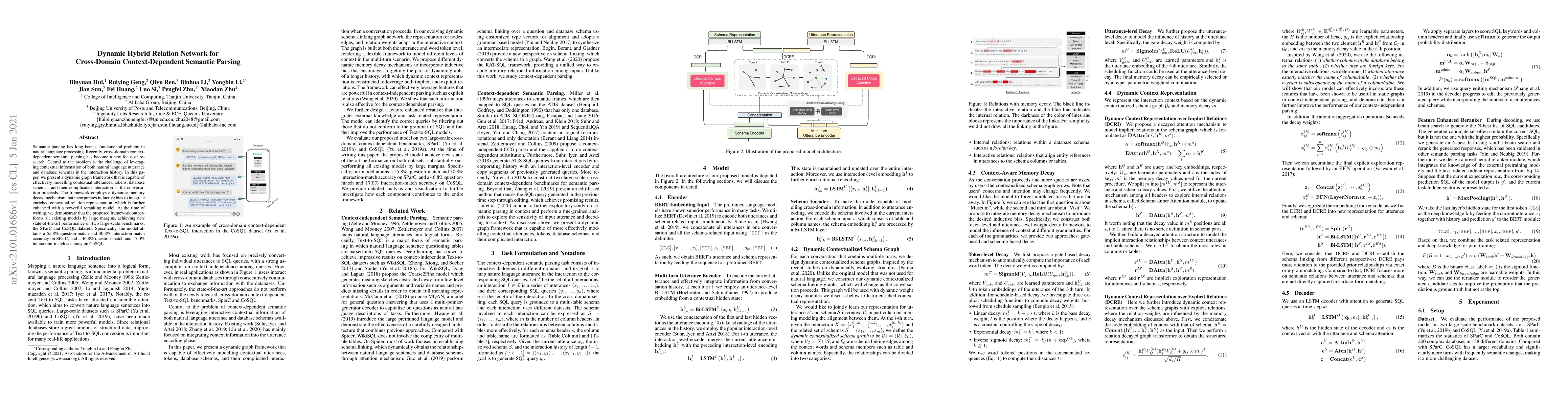 This paper introduces a dynamic hybrid relation network framework for cross-domain context-dependent semantic parsing, achieving state-of-the-art results on SParC and CoSQL datasets by effectively modeling complex interactions between utterances, tokens, and database schemas. The framework utilizes a dynamic memory decay mechanism for enriched contextual relation representation and a reranking model for superior performance.