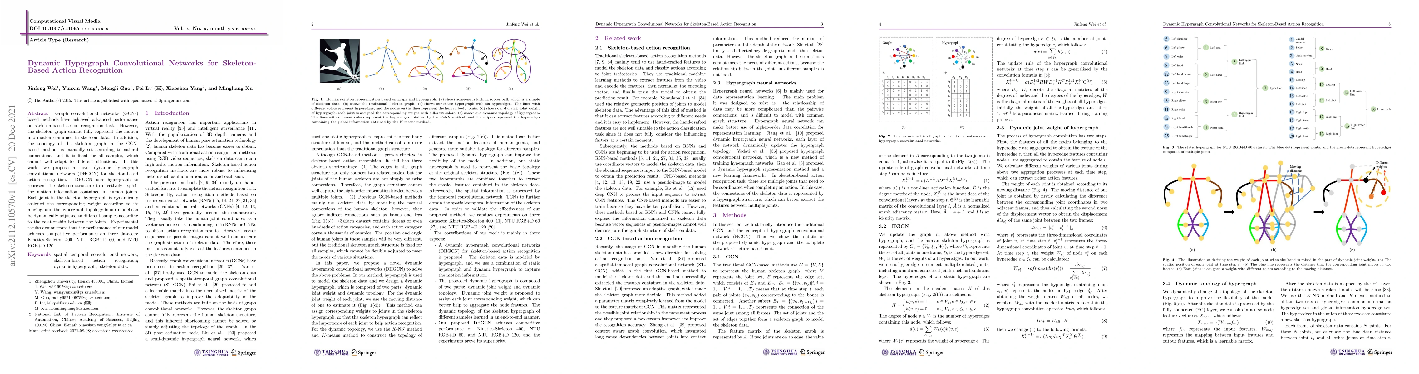 This paper proposes dynamic hypergraph convolutional networks (DHGCN) to enhance skeleton-based action recognition. Unlike static graph convolutional networks, DHGCN utilizes hypergraphs to better capture motion information and dynamically adjusts its topology to suit different samples, achieving competitive results on three datasets.