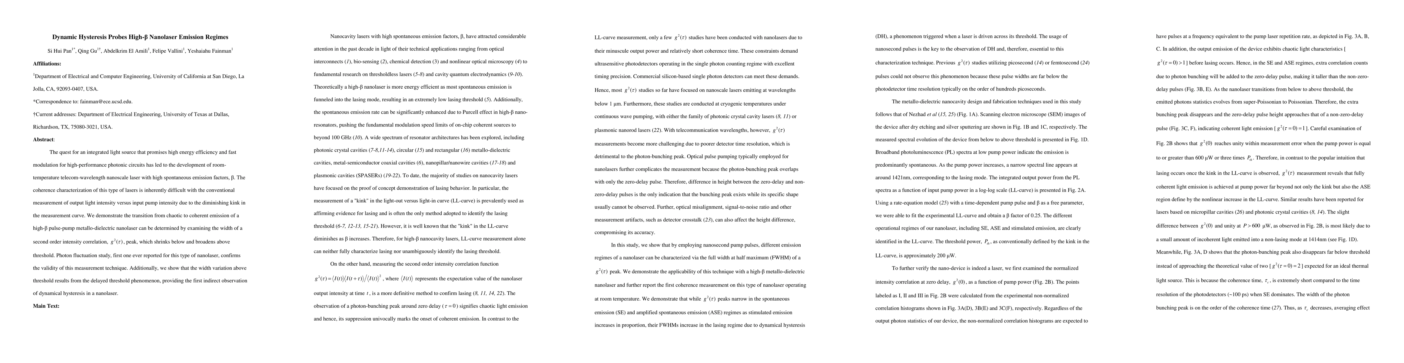 This paper investigates the emission regimes of high-{\beta} nanolasers, demonstrating a novel method to characterize their coherence by analyzing the width of second-order intensity correlation peaks. The study reveals dynamical hysteresis in these nanolasers, providing new insights into their transition from chaotic to coherent emission.