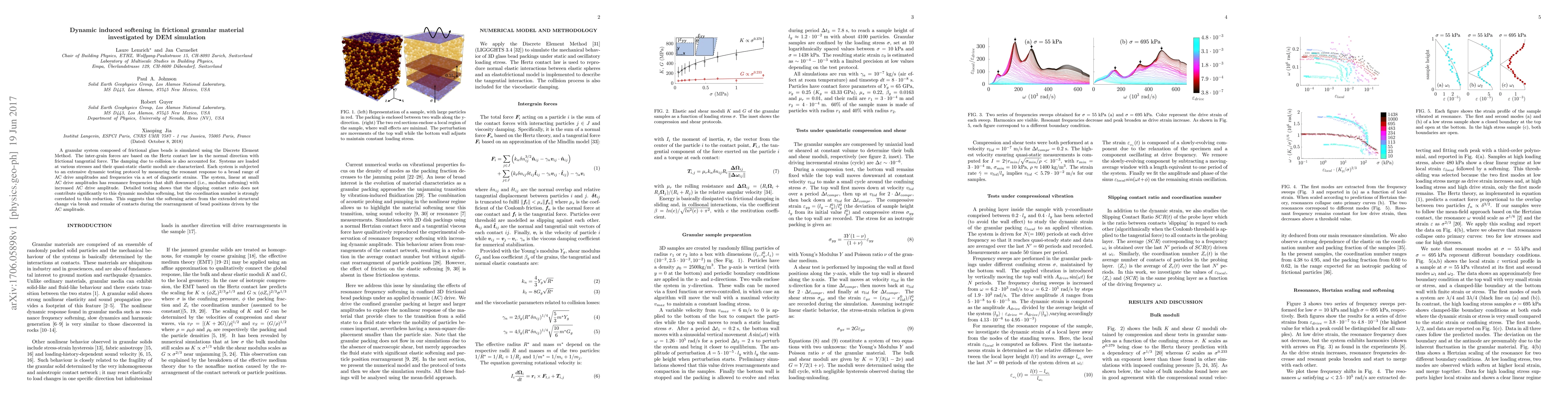 Researchers used DEM simulation to study dynamic induced softening in frictional granular material, finding that increased AC drive amplitude causes resonance frequencies to shift downward, while coordination number is strongly correlated with this reduction.