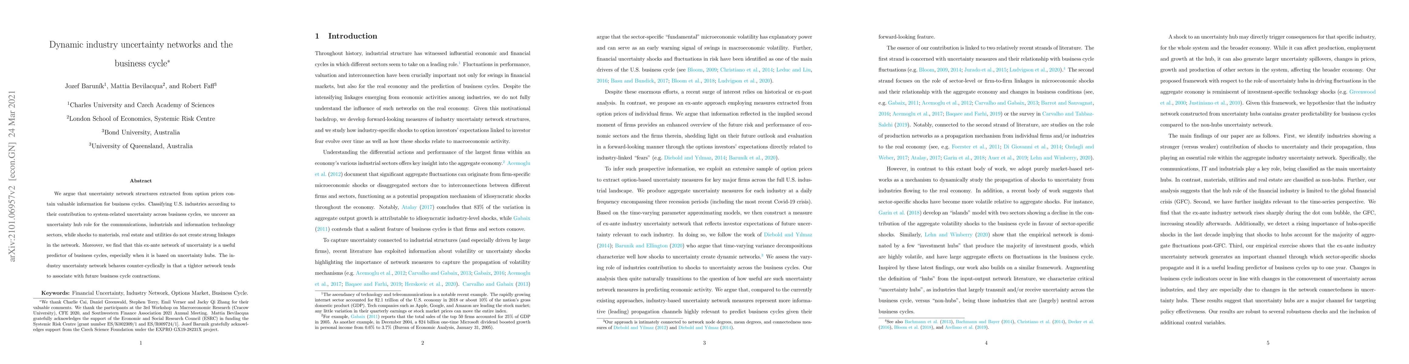 This research identifies that certain sectors like communications, industrials, and information technology act as 'uncertainty hubs' in option prices, influencing business cycles. The study finds that these network structures predict economic downturns, with a tighter uncertainty network indicating potential future contractions.