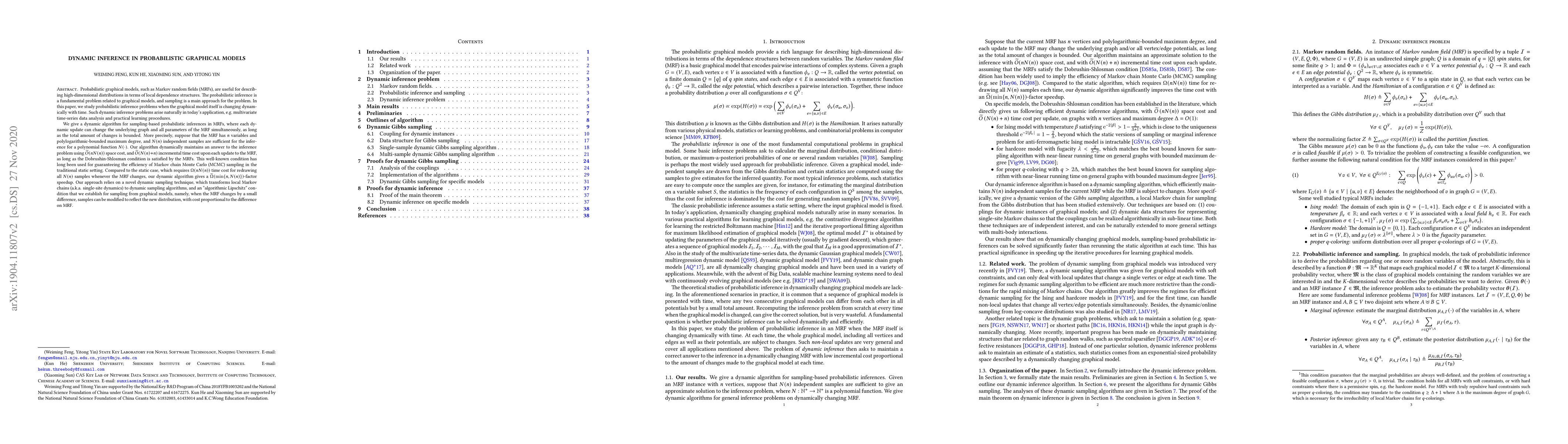 This paper proposes a dynamic algorithm for sampling-based probabilistic inference in Markov random fields (MRFs) that change over time. The algorithm achieves a significant speedup over static methods by maintaining inference results incrementally with $\widetilde{O}(n N(n))$ space and $\widetilde{O}(N(n) + n)$ time per update, under certain conditions.