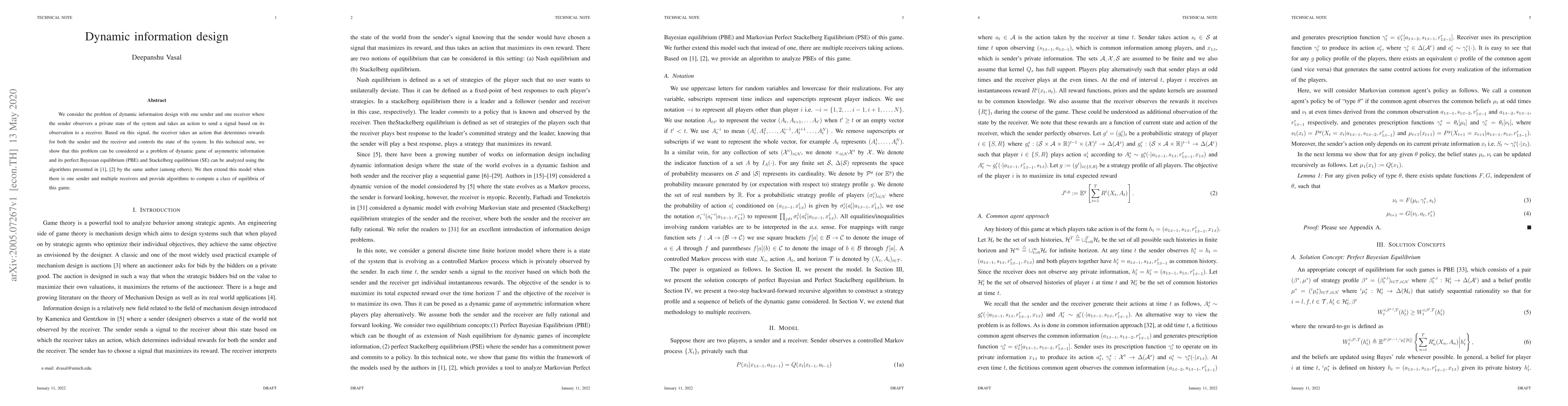 We consider the problem of dynamic information design with one sender and one receiver where the sender observers a private state of the system and takes an action to send a signal based on its observation to a receiver. Based on this signal, the receiver takes an action that determines rewards for both the sender and the receiver and controls the state of the system. In this technical note, we show that this problem can be considered as a problem of dynamic game of asymmetric information and its perfect Bayesian equilibrium (PBE) and Stackelberg equilibrium (SE) can be analyzed using the algorithms presented in [1], [2] by the same author (among others). We then extend this model when there is one sender and multiple receivers and provide algorithms to compute a class of equilibria of this game.