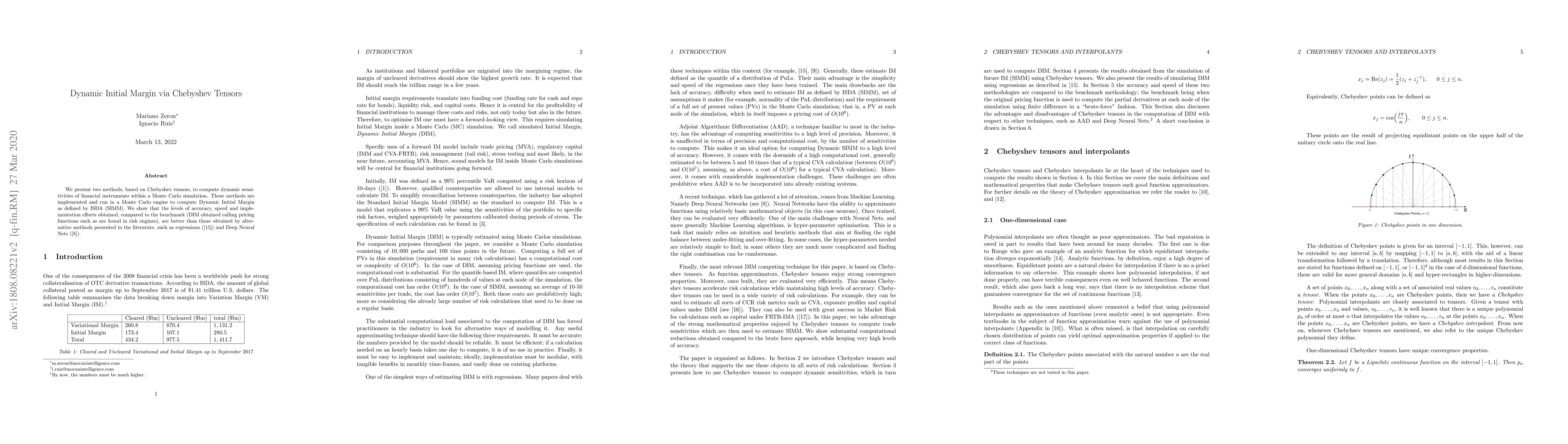 The paper presents two methods using Chebyshev tensors to compute dynamic sensitivities of financial instruments within a Monte Carlo simulation for Dynamic Initial Margin (DIM) calculation as per ISDA SIMM. These methods are compared to a benchmark using pricing functions from risk engines.