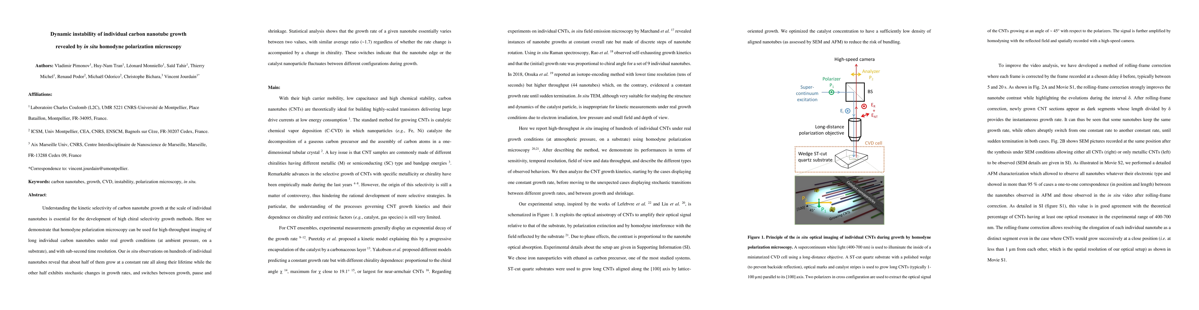 Title: Dynamic instability of individual carbon nanotube growth revealed by in situ homodyne polarization microscopy Summary: Homodyne polarization microscopy allows real-time imaging of carbon nanotube growth, revealing half grow steadily while the other half exhibits fluctuating growth rates, indicating dynamic instability and fluctuating configurations during growth.