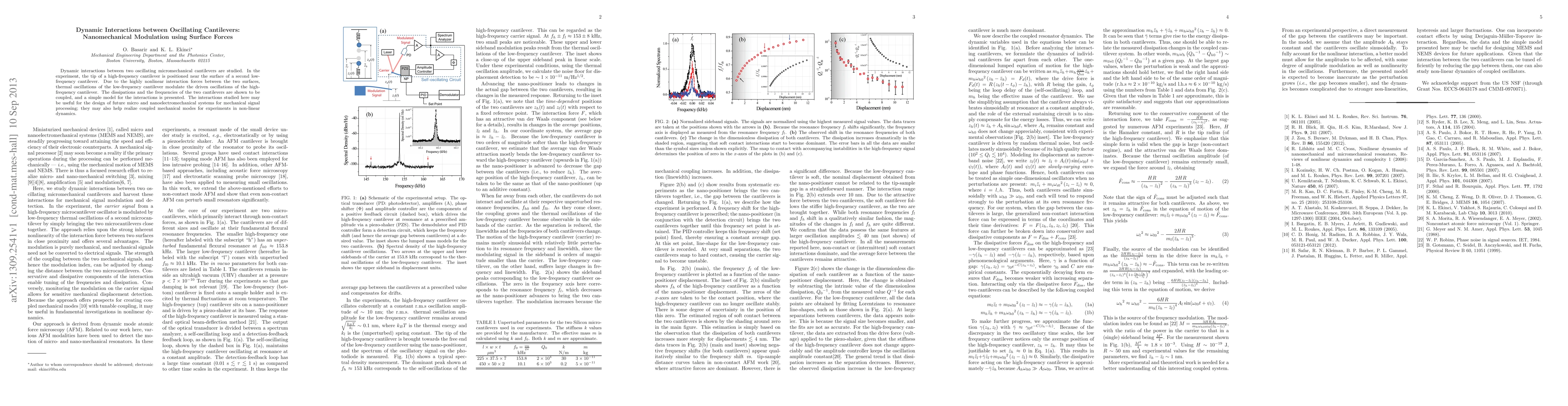 This paper explores how two oscillating cantilevers interact with each other through surface forces, leading to coupled dissipations and frequencies in a non-linear dynamic system.