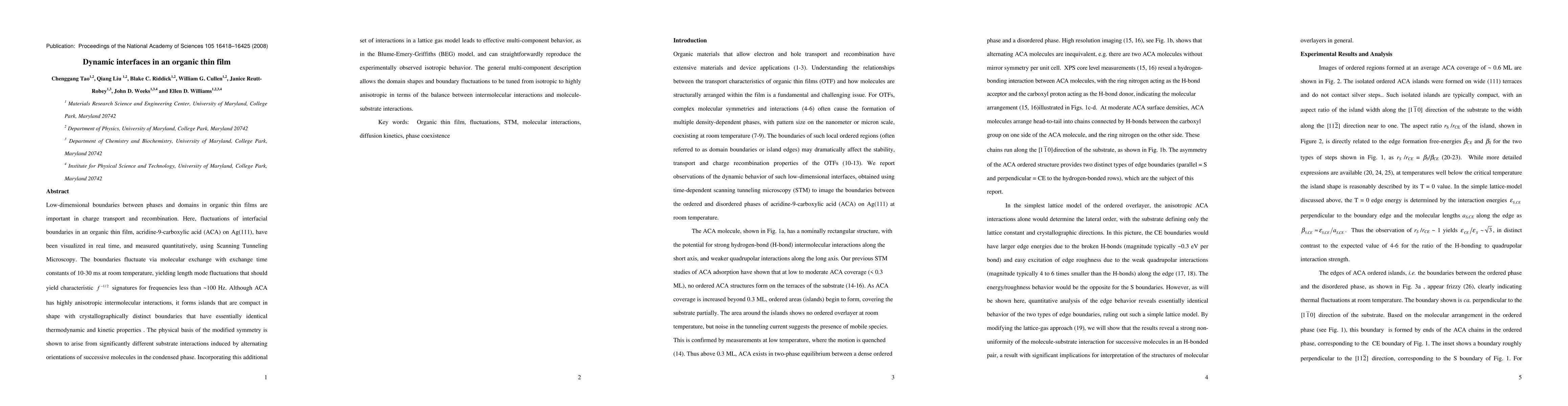 Low-dimensional boundaries between phases and domains in organic thin films are important in charge transport and recombination. Here, fluctuations of interfacial boundaries in an organic thin film, acridine-9-carboxylic acid (ACA) on Ag(111), have been visualized in real time, and measured quantitatively, using Scanning Tunneling Microscopy. The boundaries fluctuate via molecular exchange with exchange time constants of 10-30 ms at room temperature, yielding length mode fluctuations that should yield characteristic f-1/2 signatures for frequencies less than ~100 Hz. Although ACA has highly anisotropic intermolecular interactions, it forms islands that are compact in shape with crystallographically distinct boundaries that have essentially identical thermodynamic and kinetic properties . The physical basis of the modified symmetry is shown to arise from significantly different substrate interactions induced by alternating orientations of successive molecules in the condensed phase. Incorporating this additional set of interactions in a lattice gas model leads to effective multi-component behavior, as in the Blume-Emery-Griffiths (BEG) model, and can straightforwardly reproduce the experimentally observed isotropic behavior. The general multi-component description allows the domain shapes and boundary fluctuations to be tuned from isotropic to highly anisotropic in terms of the balance between intermolecular interactions and molecule-substrate interactions. Key words: Organic thin film, fluctuations, STM, molecular interactions, diffusion kinetics, phase coexistence