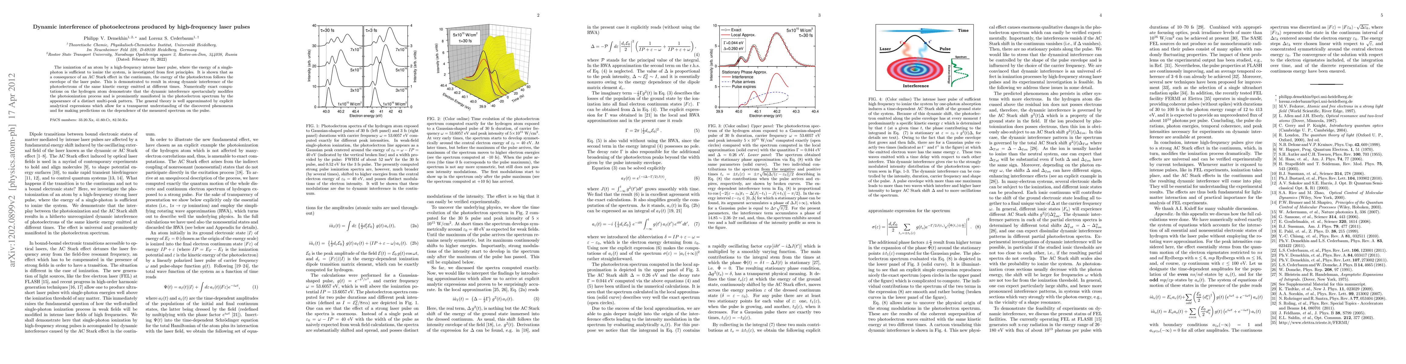 This research investigates how high-frequency laser pulses ionize atoms, showing that photoelectron energy mirrors the laser pulse envelope due to the AC Stark effect. Numerical computations on hydrogen reveal distinct multi-peak patterns in the photoelectron spectrum caused by dynamic interference, with analytical expressions approximating these findings for pulse property predictions.