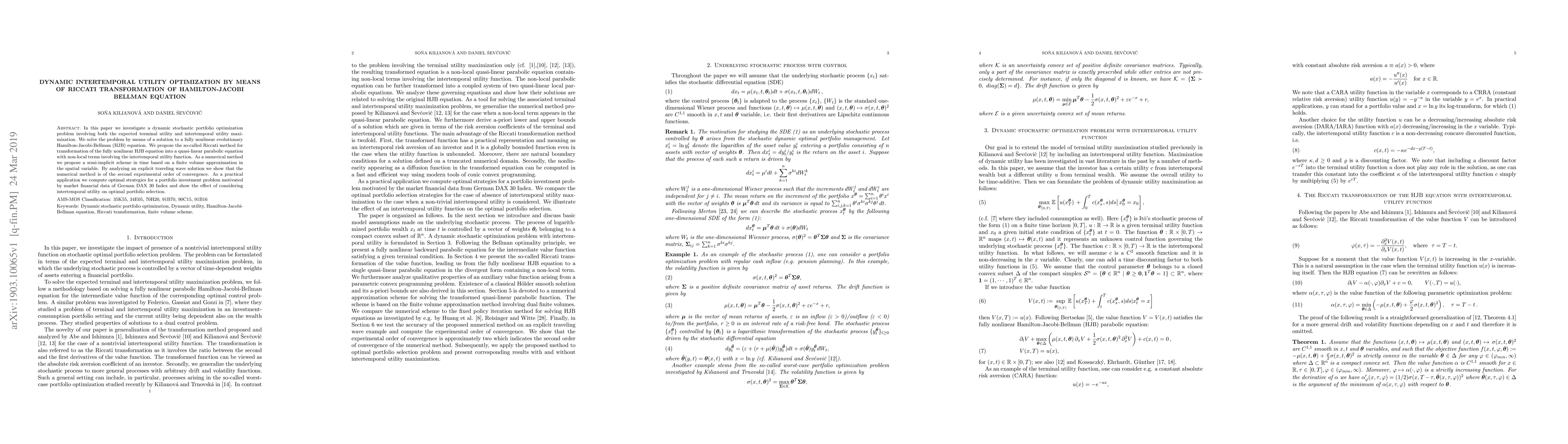 In this paper we investigate a dynamic stochastic portfolio optimization problem involving both the expected terminal utility and intertemporal utility maximization. We solve the problem by means of a solution to a fully nonlinear evolutionary Hamilton-Jacobi-Bellman (HJB) equation. We propose the so-called Riccati method for transformation of the fully nonlinear HJB equation into a quasi-linear parabolic equation with non-local terms involving the intertemporal utility function. As a numerical method we propose a semi-implicit scheme in time based on a finite volume approximation in the spatial variable. By analyzing an explicit traveling wave solution we show that the numerical method is of the second experimental order of convergence. As a practical application we compute optimal strategies for a portfolio investment problem motivated by market financial data of German DAX 30 Index and show the effect of considering intertemporal utility on optimal portfolio selection.