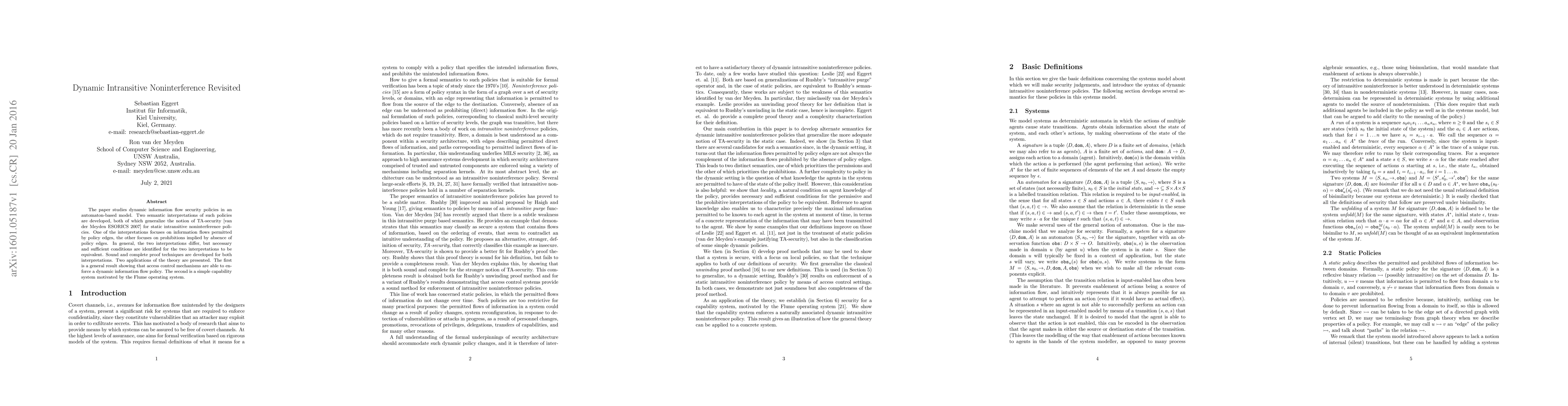 This paper explores dynamic information flow security policies in an automaton-based model, developing two interpretations that generalize static intransitive noninterference. It identifies conditions for their equivalence and provides sound and complete proof techniques, demonstrating applications in access control mechanisms and a capability system inspired by Flume.