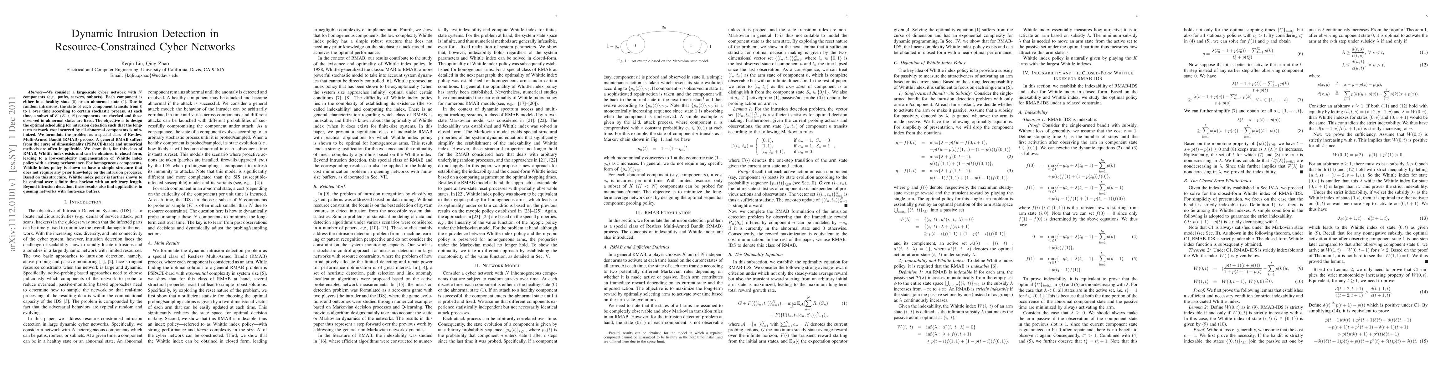 We consider a large-scale cyber network with N components (e.g., paths, servers, subnets). Each component is either in a healthy state (0) or an abnormal state (1). Due to random intrusions, the state of each component transits from 0 to 1 over time according to certain stochastic process. At each time, a subset of K (K < N) components are checked and those observed in abnormal states are fixed. The objective is to design the optimal scheduling for intrusion detection such that the long-term network cost incurred by all abnormal components is minimized. We formulate the problem as a special class of Restless Multi-Armed Bandit (RMAB) process. A general RMAB suffers from the curse of dimensionality (PSPACE-hard) and numerical methods are often inapplicable. We show that, for this class of RMAB, Whittle index exists and can be obtained in closed form, leading to a low-complexity implementation of Whittle index policy with a strong performance. For homogeneous components, Whittle index policy is shown to have a simple structure that does not require any prior knowledge on the intrusion processes. Based on this structure, Whittle index policy is further shown to be optimal over a finite time horizon with an arbitrary length. Beyond intrusion detection, these results also find applications in queuing networks with finite-size buffers.