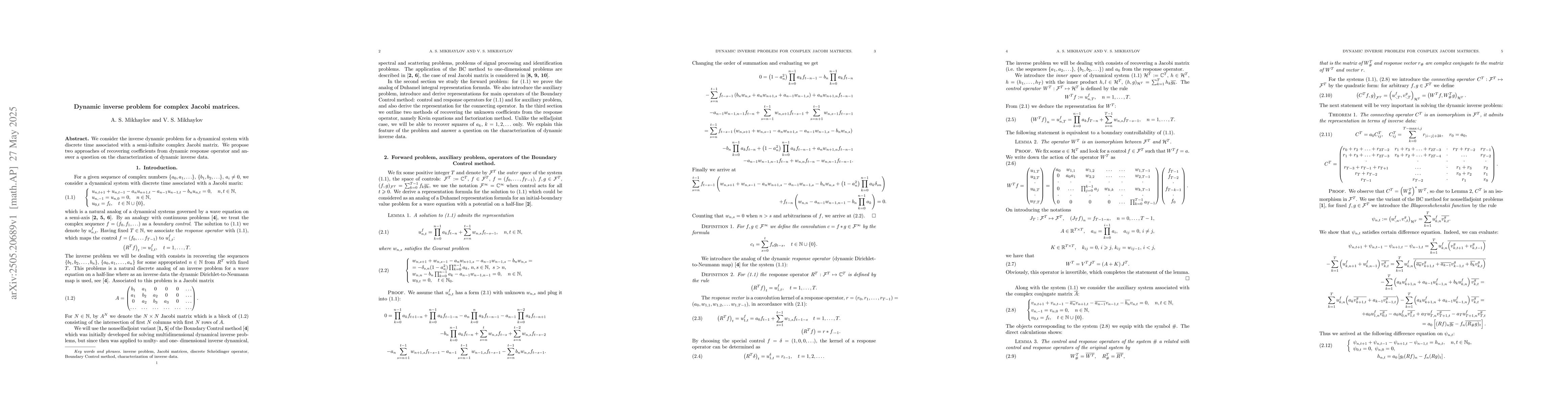 The paper presents novel approaches for recovering coefficients from dynamic response operators in the context of complex Jacobi matrices.