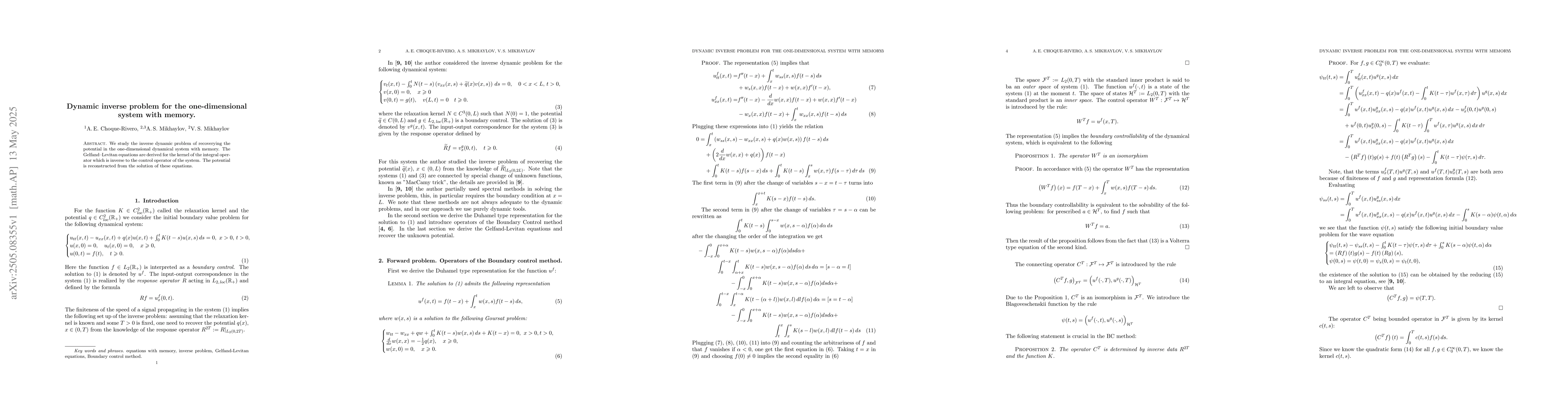 Researchers derive Gelfand-Levitan equations to reconstruct the potential in a one-dimensional dynamical system with memory, enabling recovery of the underlying dynamics from its control operator.