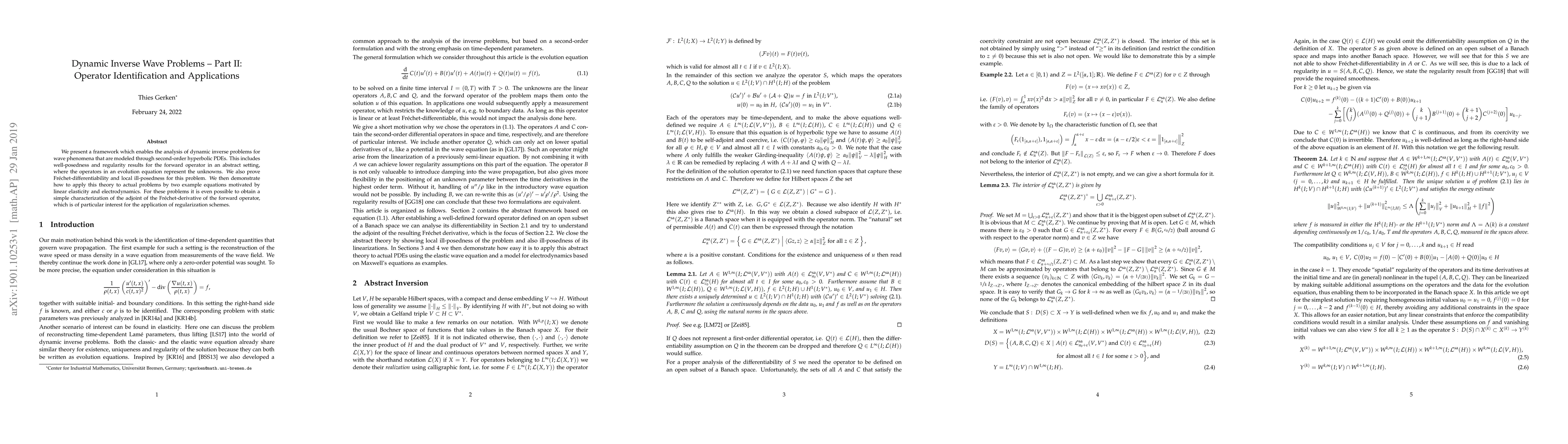 We present a framework which enables the analysis of dynamic inverse problems for wave phenomena that are modeled through second-order hyperbolic PDEs. This includes well-posedness and regularity results for the forward operator in an abstract setting, where the operators in an evolution equation represent the unknowns. We also prove Fr\'echet-differentiability and local ill-posedness for this problem. We then demonstrate how to apply this theory to actual problems by two example equations motivated by linear elasticity and electrodynamics. For these problems it is even possible to obtain a simple characterization of the adjoint of the Fr\'echet-derivative of the forward operator, which is of particular interest for the application of regularization schemes.