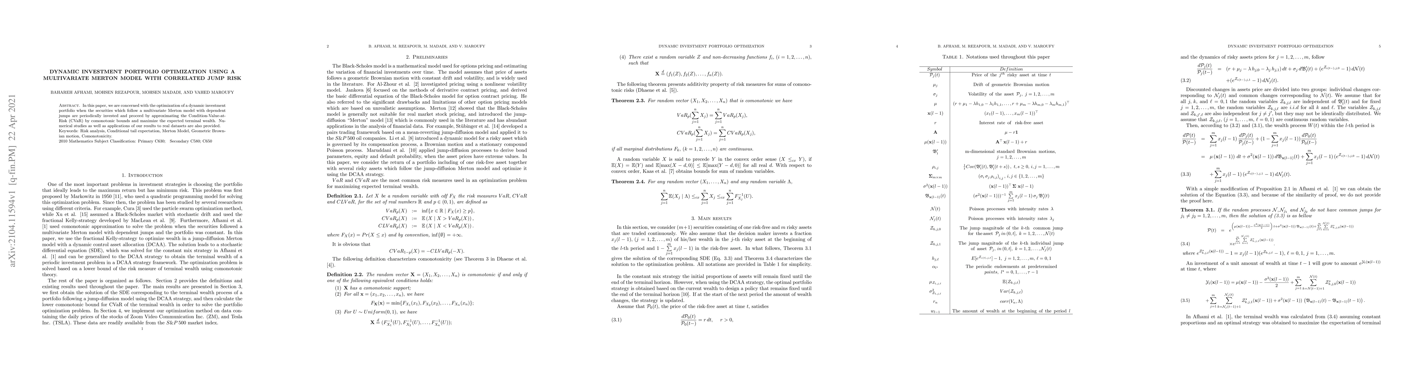 This paper optimizes dynamic investment portfolios under a multivariate Merton model with correlated jump risks, using comonotonic bounds to approximate Condition-Value-at-Risk (CVaR) and maximizing expected terminal wealth, with numerical studies and real dataset applications.