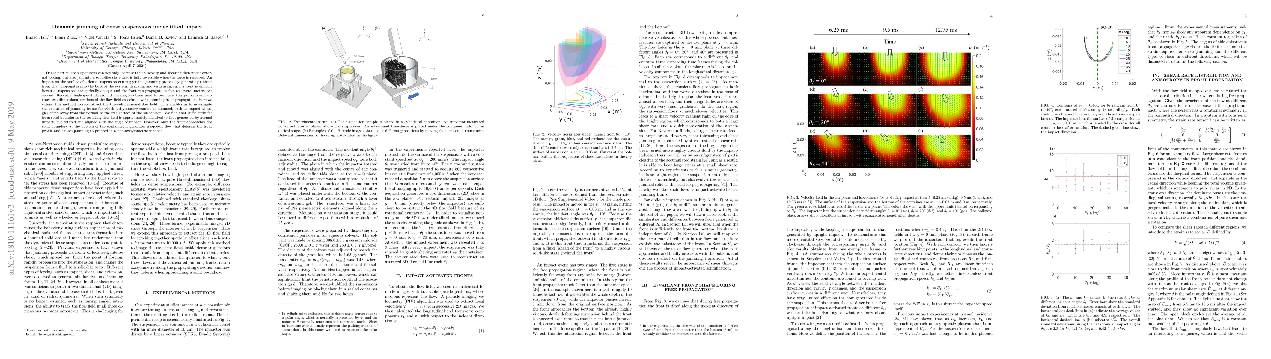Dense particulate suspensions can not only increase their viscosity and shear thicken under external forcing, but also jam into a solid-like state that is fully reversible when the force is removed. An impact on the surface of a dense suspension can trigger this jamming process by generating a shear front that propagates into the bulk of the system. Tracking and visualizing such a front is difficult because suspensions are optically opaque and the front can propagate as fast as several meters per second. Recently, high-speed ultrasound imaging has been used to overcome this problem and extract two-dimensional sections of the flow field associated with jamming front propagation. Here we extend this method to reconstruct the three-dimensional flow field. This enables us to investigate the evolution of jamming fronts for which axisymmetry cannot be assumed, such as impact at angles tilted away from the normal to the free surface of the suspension. We find that sufficiently far from solid boundaries the resulting flow field is approximately identical to that generated by normal impact, but rotated and aligned with the angle of impact. However, once the front approaches the solid boundary at the bottom of the container, it generates a squeeze flow that deforms the front profile and causes jamming to proceed in a non-axisymmetric manner.