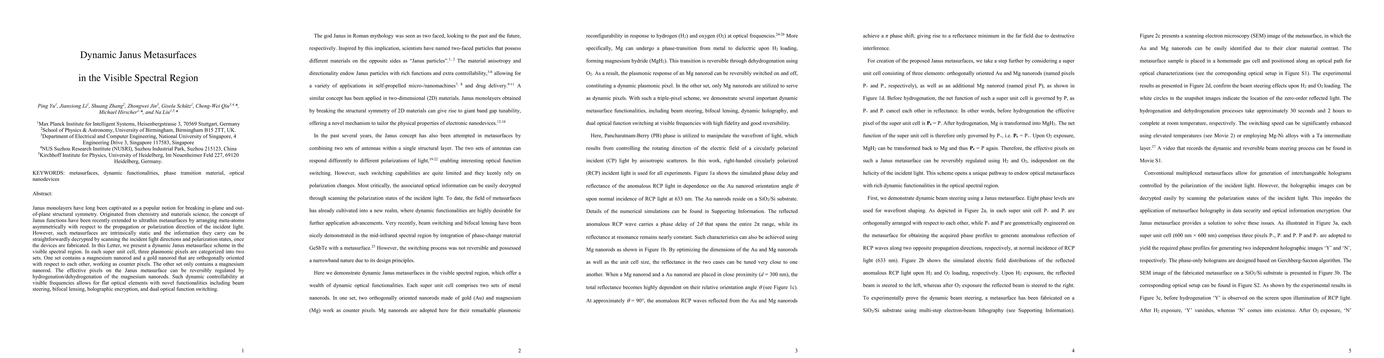 This paper introduces dynamic Janus metasurfaces in the visible spectral region, where plasmonic pixels can be reversibly controlled via hydrogenation/dehydrogenation of magnesium nanorods, enabling functionalities like beam steering and holographic encryption.