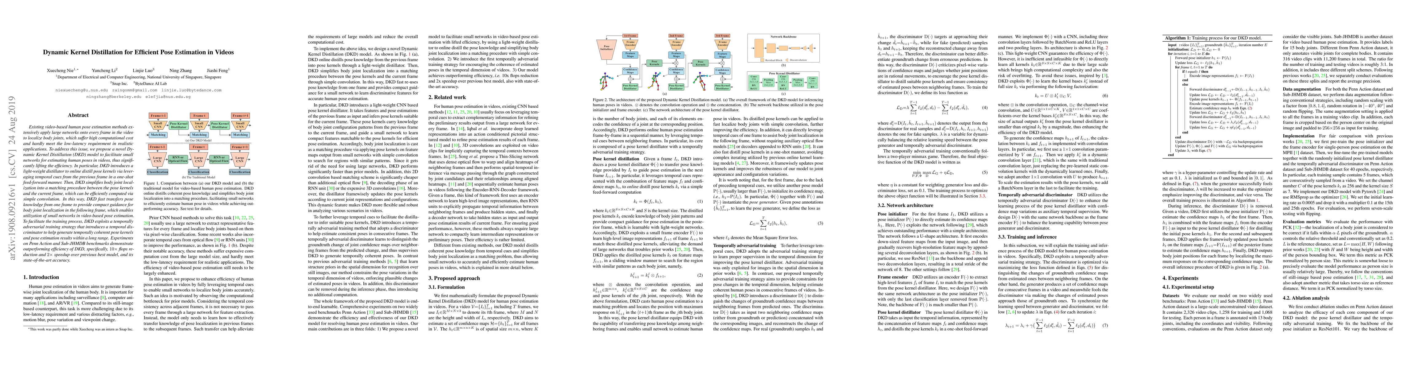 The paper proposes Dynamic Kernel Distillation (DKD) to enhance the efficiency of small networks for video-based human pose estimation by transferring pose knowledge from previous frames through a lightweight distillator. DKD achieves significant computational efficiency and maintains state-of-the-art accuracy, demonstrating a 10x reduction in flops and a 2x speedup compared to the best previous model.