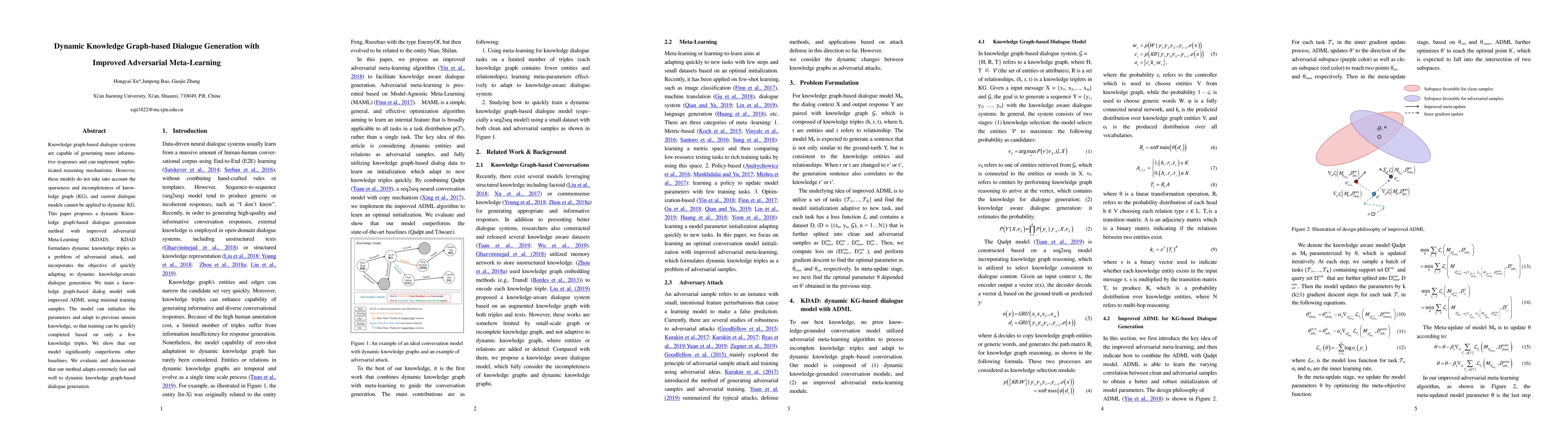This paper proposes KDAD, a dynamic Knowledge graph-based dialogue generation method with improved adversarial Meta-Learning, which quickly adapts to sparse and incomplete knowledge graphs and minimal training samples. The model significantly outperforms baselines, demonstrating rapid adaptation to dynamic knowledge-aware dialogue generation.