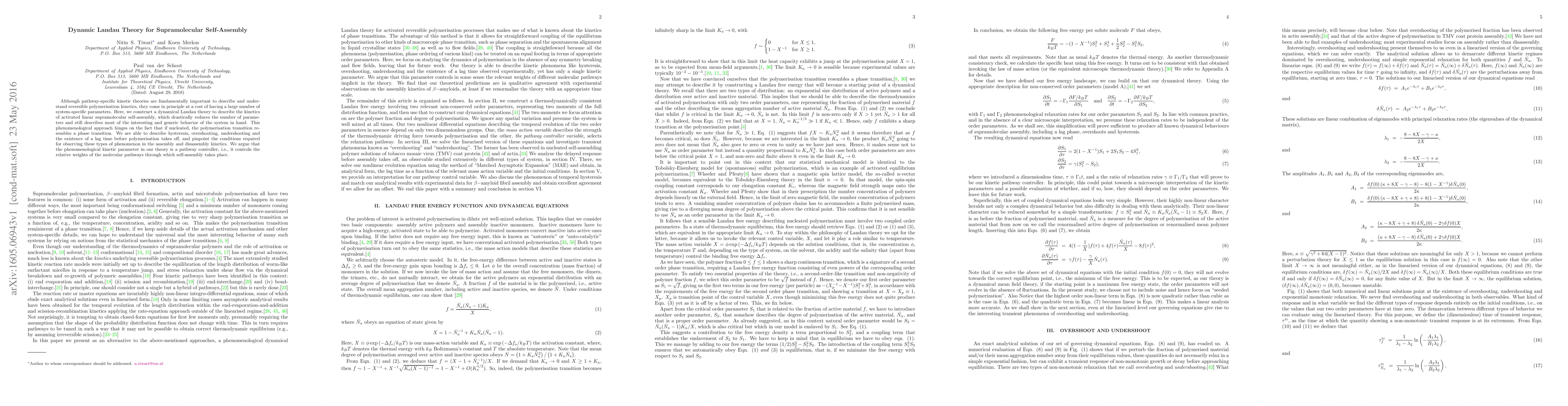 This paper develops a dynamic Landau theory to simplify the description of supramolecular self-assembly kinetics, reducing the number of system-specific parameters. It captures generic behaviors like hysteresis and lag times, identifying conditions for these phenomena and highlighting a phenomenological parameter that controls the relative importance of different molecular pathways.