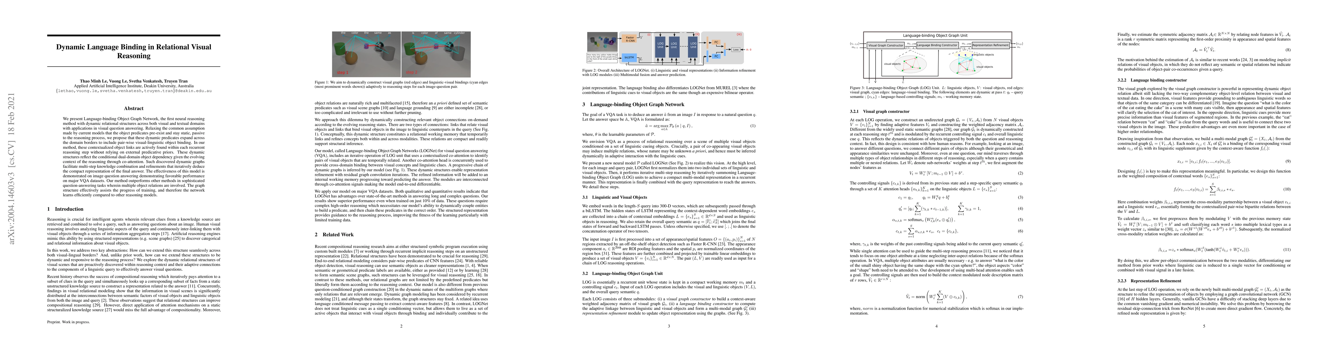 The novelty of this work lies in its dynamic language binding approach, contrasting with existing neural reasoning methods that assume static object predicates. LOGNet actively finds contextualized object links within each recurrent reasoning step, reflecting conditional dual-domain object dependency given the evolving context of the reasoning through co-attention.