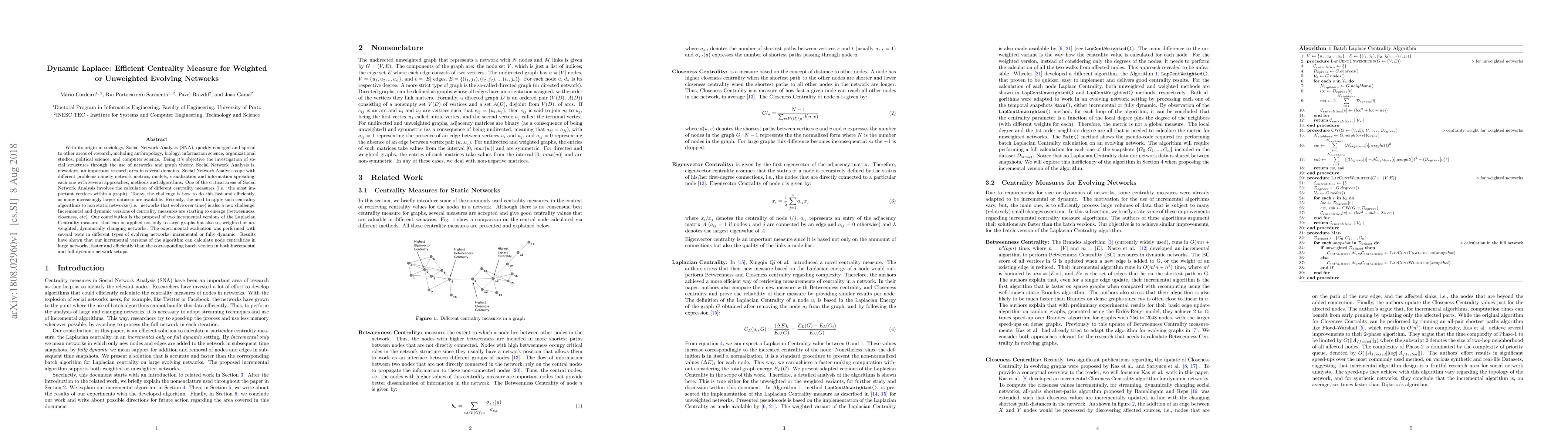 With its origin in sociology, Social Network Analysis (SNA), quickly emerged and spread to other areas of research, including anthropology, biology, information science, organizational studies, political science, and computer science. Being it's objective the investigation of social structures through the use of networks and graph theory, Social Network Analysis is, nowadays, an important research area in several domains. Social Network Analysis cope with different problems namely network metrics, models, visualization and information spreading, each one with several approaches, methods and algorithms. One of the critical areas of Social Network Analysis involves the calculation of different centrality measures (i.e.: the most important vertices within a graph). Today, the challenge is how to do this fast and efficiently, as many increasingly larger datasets are available. Recently, the need to apply such centrality algorithms to non static networks (i.e.: networks that evolve over time) is also a new challenge. Incremental and dynamic versions of centrality measures are starting to emerge (betweenness, closeness, etc). Our contribution is the proposal of two incremental versions of the Laplacian Centrality measure, that can be applied not only to large graphs but also to, weighted or unweighted, dynamically changing networks. The experimental evaluation was performed with several tests in different types of evolving networks, incremental or fully dynamic. Results have shown that our incremental versions of the algorithm can calculate node centralities in large networks, faster and efficiently than the corresponding batch version in both incremental and full dynamic network setups.