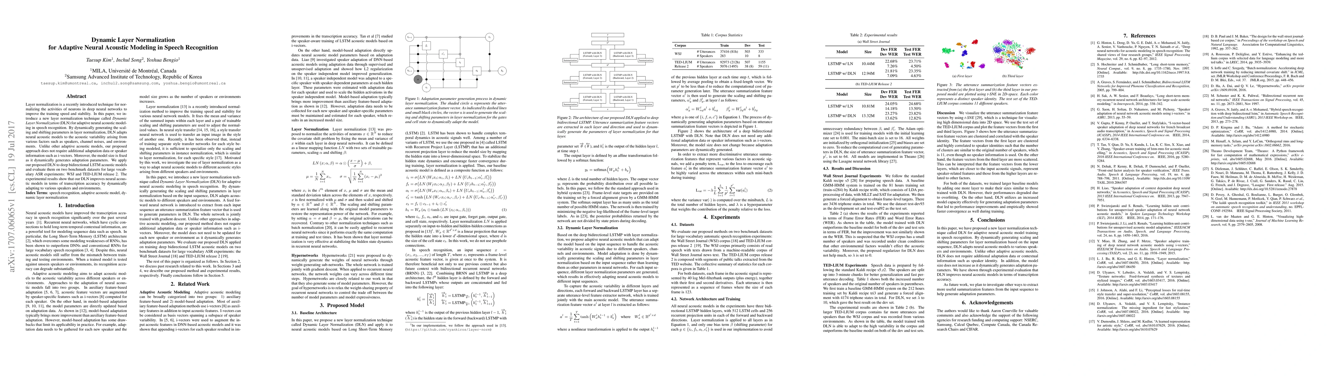 This paper introduces Dynamic Layer Normalization (DLN) to adaptively improve neural acoustic models for speech recognition, achieving better transcription accuracy without requiring additional adaptation data. DLN dynamically adjusts layer normalization parameters to handle acoustic variability, showing improved performance on WSJ and TED-LIUM datasets.