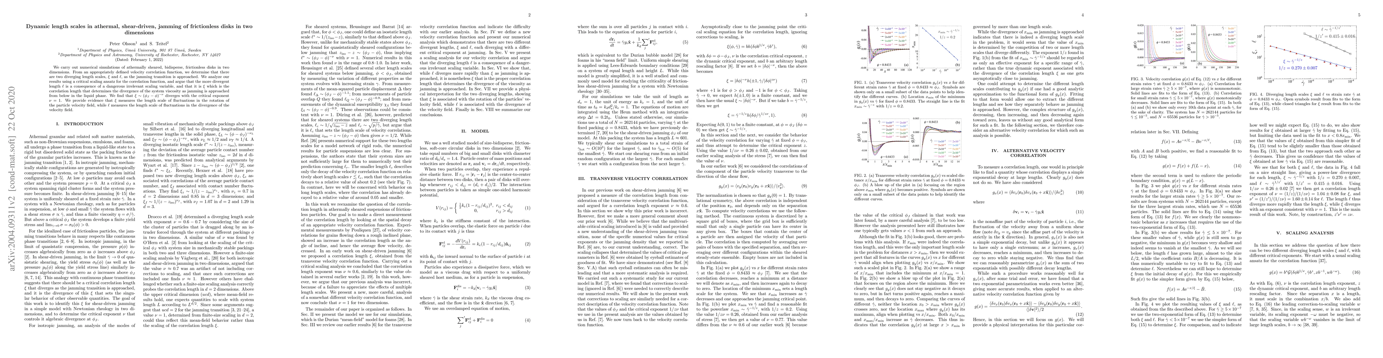 This paper investigates numerical simulations of shear-driven jamming in athermal, bidisperse frictionless disks, revealing two diverging length scales, $\xi$ and $\ell$, near the jamming transition. The study finds that $\xi$, with a critical exponent $\nu=1$, determines the divergence of system viscosity and measures rotational velocity fluctuations, while $\ell$ is a consequence of a dangerous irrelevant scaling variable.