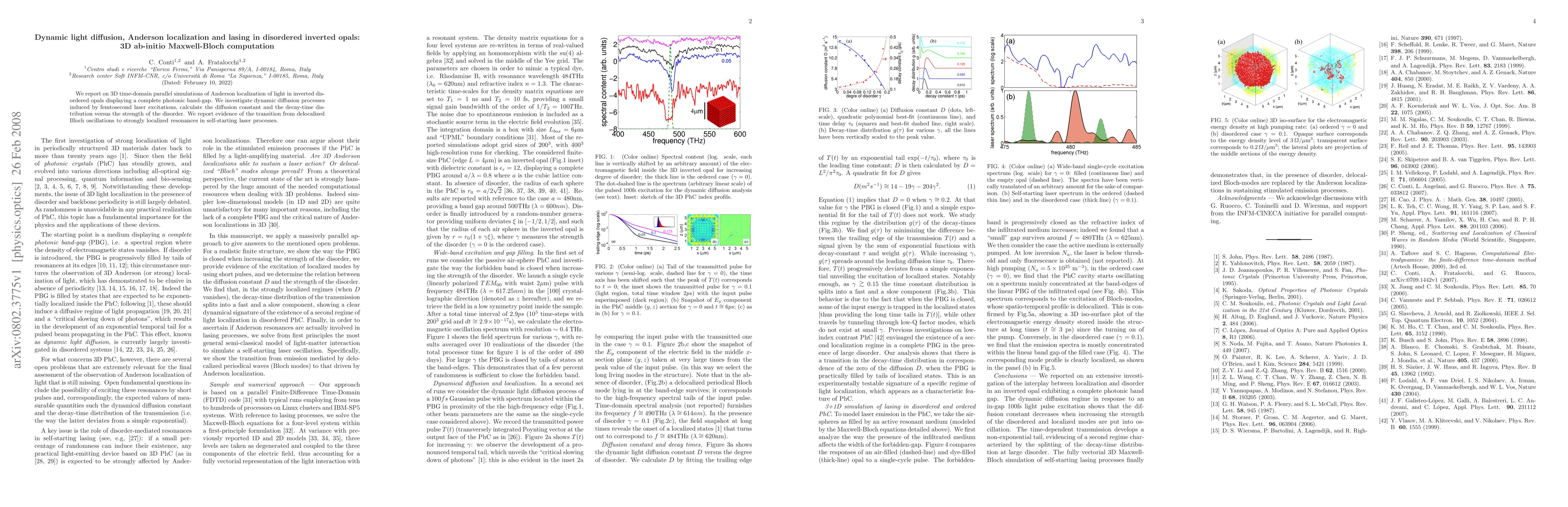 This paper reports on 3D simulations revealing Anderson localization of light in disordered inverted opals, showing dynamic diffusion processes and transitions from Bloch oscillations to localized resonances in photonic structures. It also investigates the diffusion constant and decay-time distribution in relation to disorder strength.