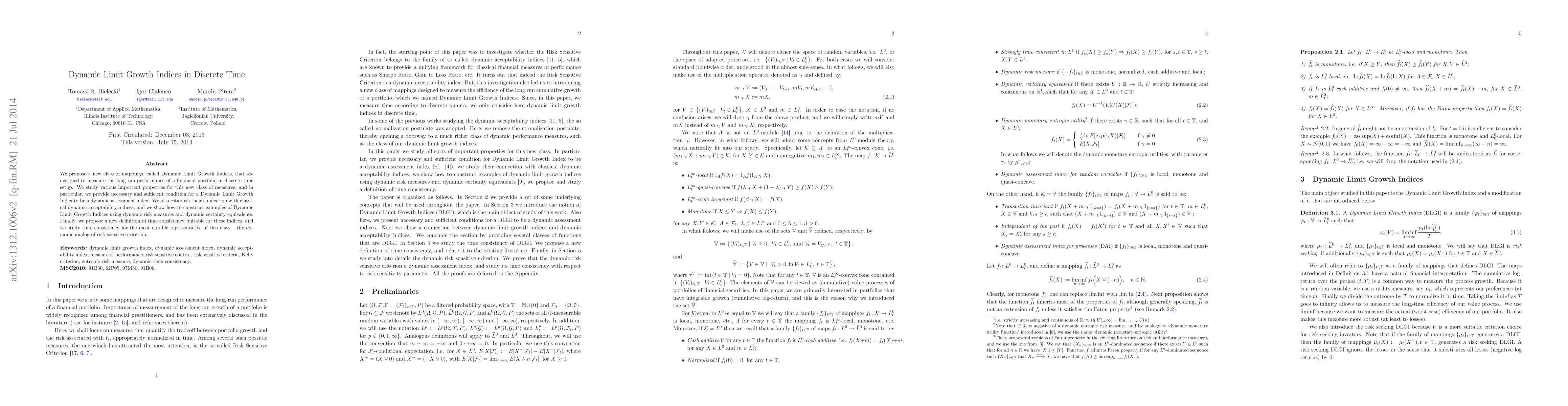 We propose a new class of mappings, called Dynamic Limit Growth Indices, that are designed to measure the long-run performance of a financial portfolio in discrete time setup. We study various important properties for this new class of measures, and in particular, we provide necessary and sufficient condition for a Dynamic Limit Growth Index to be a dynamic assessment index. We also establish their connection with classical dynamic acceptability indices, and we show how to construct examples of Dynamic Limit Growth Indices using dynamic risk measures and dynamic certainty equivalents. Finally, we propose a new definition of time consistency, suitable for these indices, and we study time consistency for the most notable representative of this class -- the dynamic analog of risk sensitive criterion.