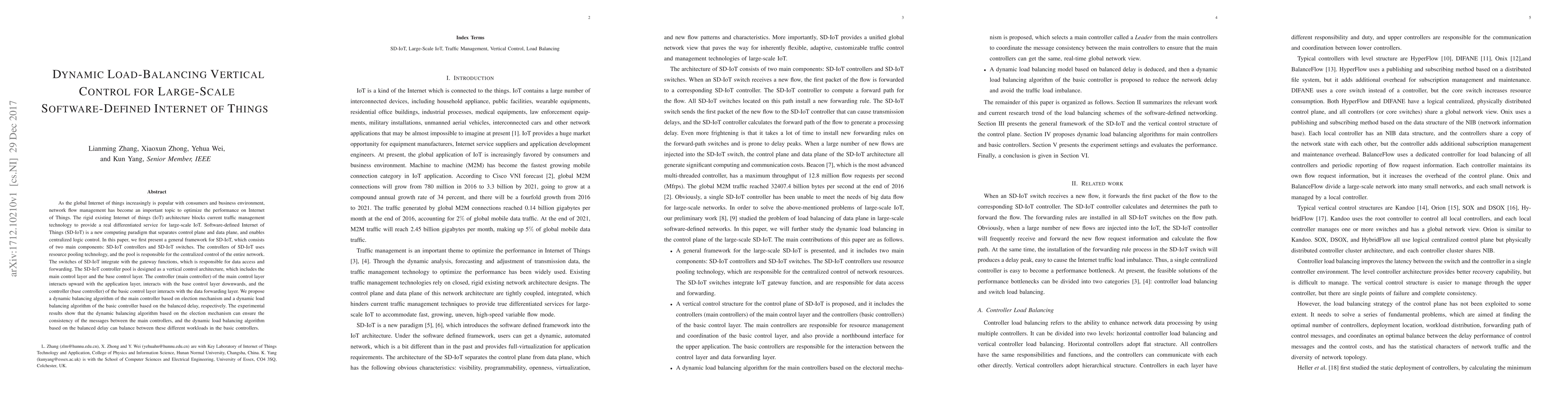 This paper presents a framework for Software-defined Internet of Things (SD-IoT) featuring dynamic load-balancing vertical control to optimize performance. It introduces SD-IoT controllers and switches, proposing dynamic balancing algorithms for the main and base controllers to ensure message consistency and workload distribution.