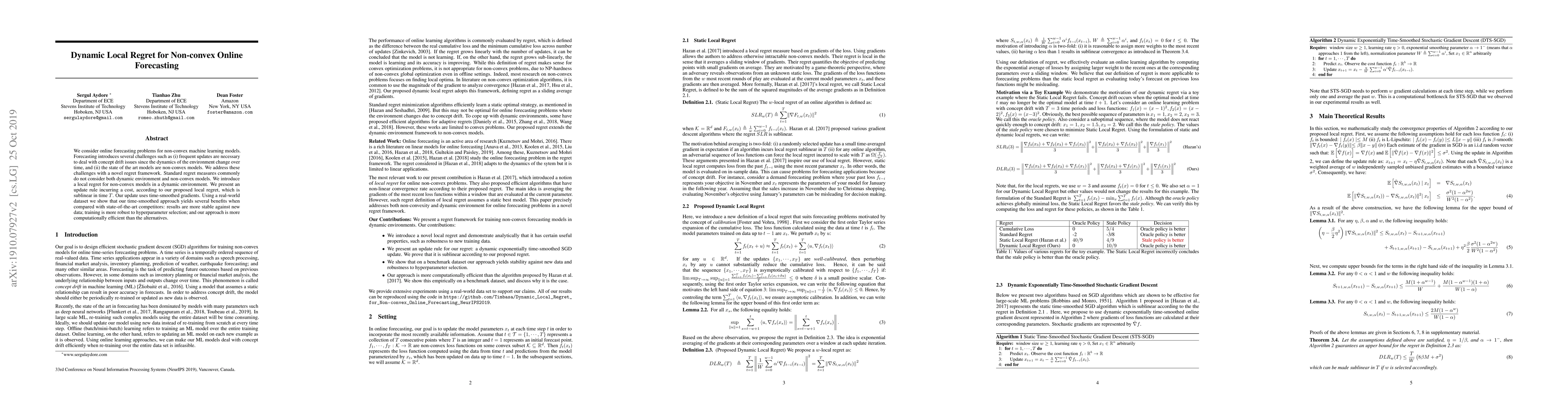 We consider online forecasting problems for non-convex machine learning models. Forecasting introduces several challenges such as (i) frequent updates are necessary to deal with concept drift issues since the dynamics of the environment change over time, and (ii) the state of the art models are non-convex models. We address these challenges with a novel regret framework. Standard regret measures commonly do not consider both dynamic environment and non-convex models. We introduce a local regret for non-convex models in a dynamic environment. We present an update rule incurring a cost, according to our proposed local regret, which is sublinear in time T. Our update uses time-smoothed gradients. Using a real-world dataset we show that our time-smoothed approach yields several benefits when compared with state-of-the-art competitors: results are more stable against new data; training is more robust to hyperparameter selection; and our approach is more computationally efficient than the alternatives.