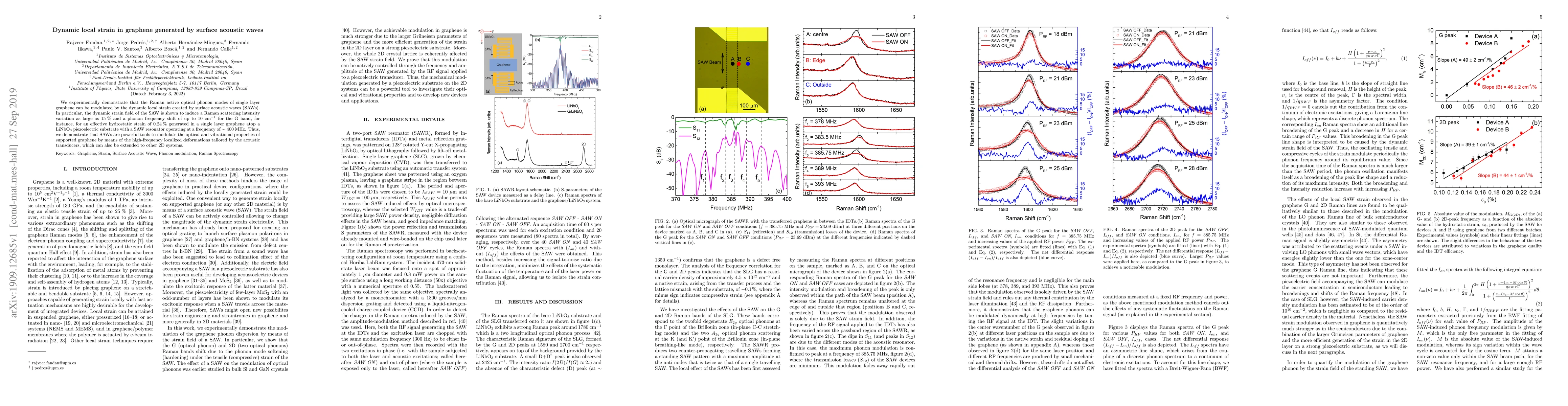 This paper demonstrates that surface acoustic waves (SAWs) can dynamically modulate the local strain in single-layer graphene, resulting in significant changes in Raman scattering intensity and phonon frequency. The study shows a 15% intensity variation and a 10 cm$^{-1}$ phonon frequency shift for the G band, indicating SAWs as effective tools for altering the optical and vibrational properties of graphene and potentially other 2D materials.