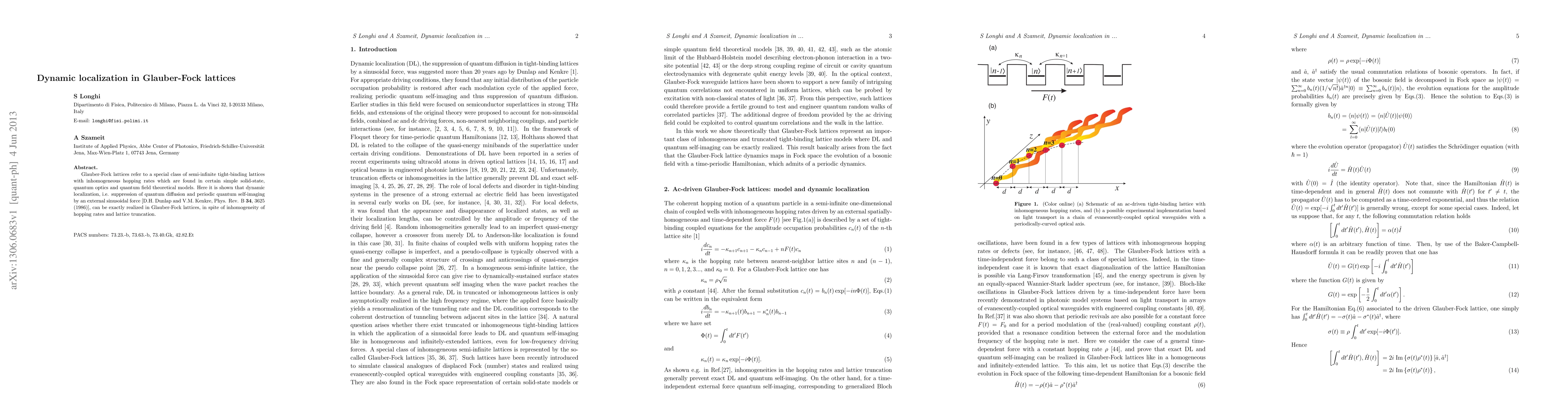 Dynamic localization in Glauber-Fock lattices demonstrates the suppression of quantum diffusion and periodic self-imaging under an external sinusoidal force, despite the inhomogeneity and truncation of the lattice. This effect is shown to be exactly realizable in these semi-infinite tight-binding lattices.