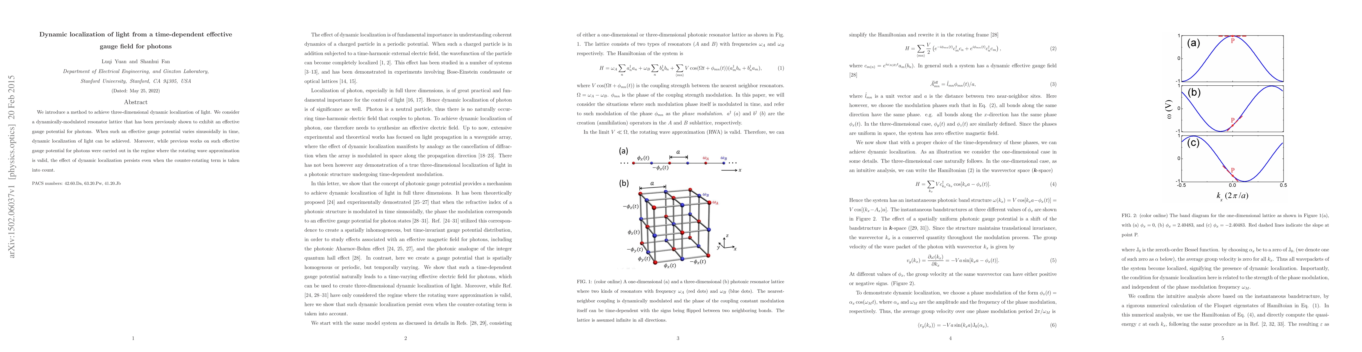 We introduce a method to achieve three-dimensional dynamic localization of light. We consider a dynamically-modulated resonator lattice that has been previously shown to exhibit an effective gauge potential for photons. When such an effective gauge potential varies sinusoidally in time, dynamic localization of light can be achieved. Moreover, while previous works on such effective gauge potential for photons were carried out in the regime where the rotating wave approximation is valid, the effect of dynamic localization persists even when the counter-rotating term is taken into count.