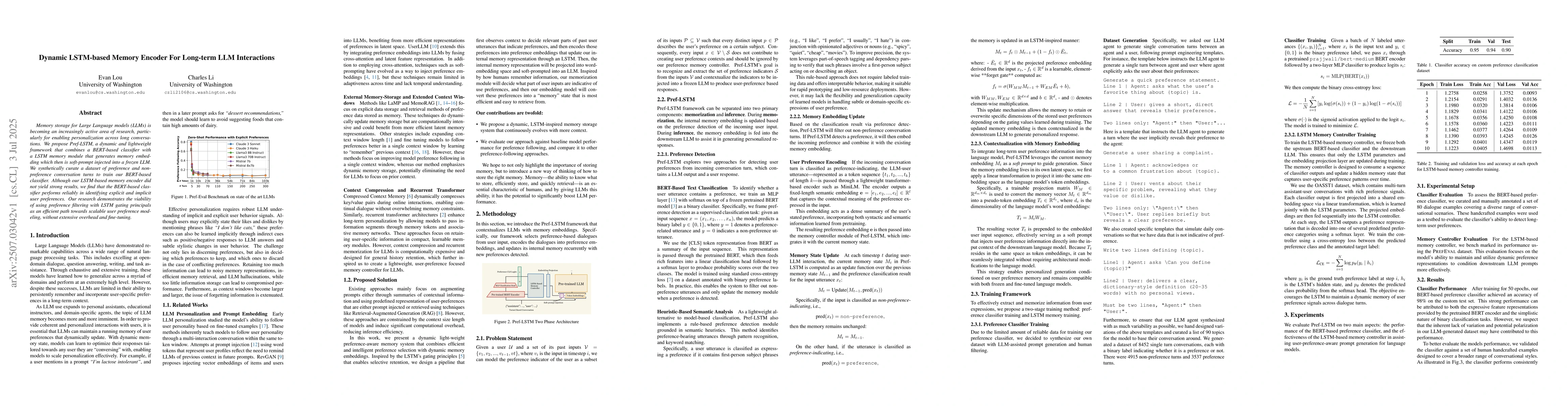 Memory storage for Large Language models (LLMs) is becoming an increasingly active area of research, particularly for enabling personalization across long conversations. We propose Pref-LSTM, a dynamic and lightweight framework that combines a BERT-based classifier with a LSTM memory module that generates memory embedding which then is soft-prompt injected into a frozen LLM. We synthetically curate a dataset of preference and non-preference conversation turns to train our BERT-based classifier. Although our LSTM-based memory encoder did not yield strong results, we find that the BERT-based classifier performs reliably in identifying explicit and implicit user preferences. Our research demonstrates the viability of using preference filtering with LSTM gating principals as an efficient path towards scalable user preference modeling, without extensive overhead and fine-tuning.