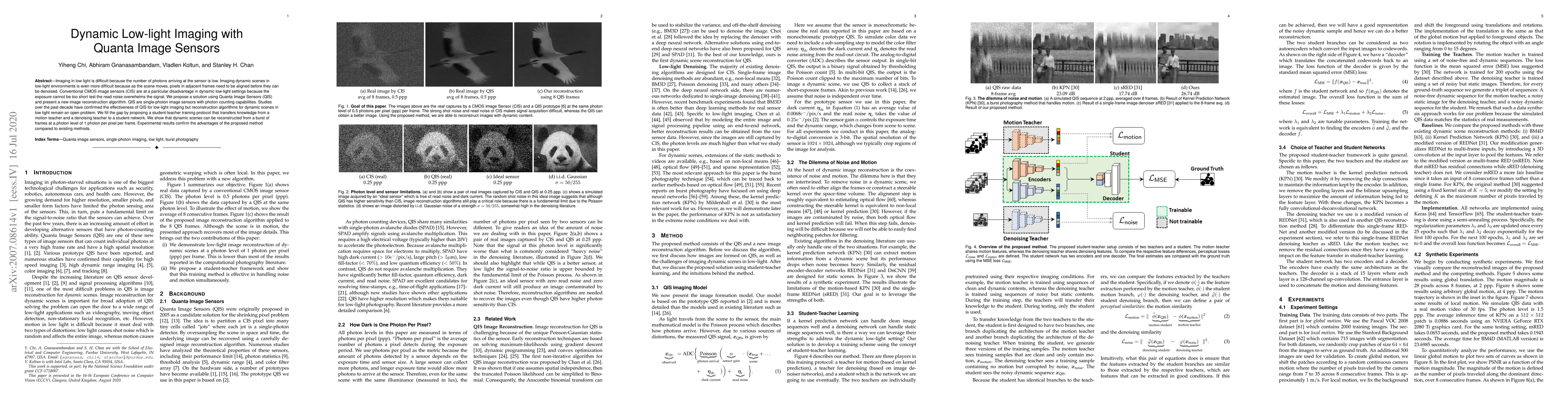 This paper proposes a novel image reconstruction algorithm using Quanta Image Sensors (QIS) for dynamic low-light imaging, addressing the challenge of aligning and denoised pixels in moving scenes. The method employs a student-teacher training protocol to improve reconstruction quality, demonstrating effective results at photon levels as low as 1 photon per pixel per frame.