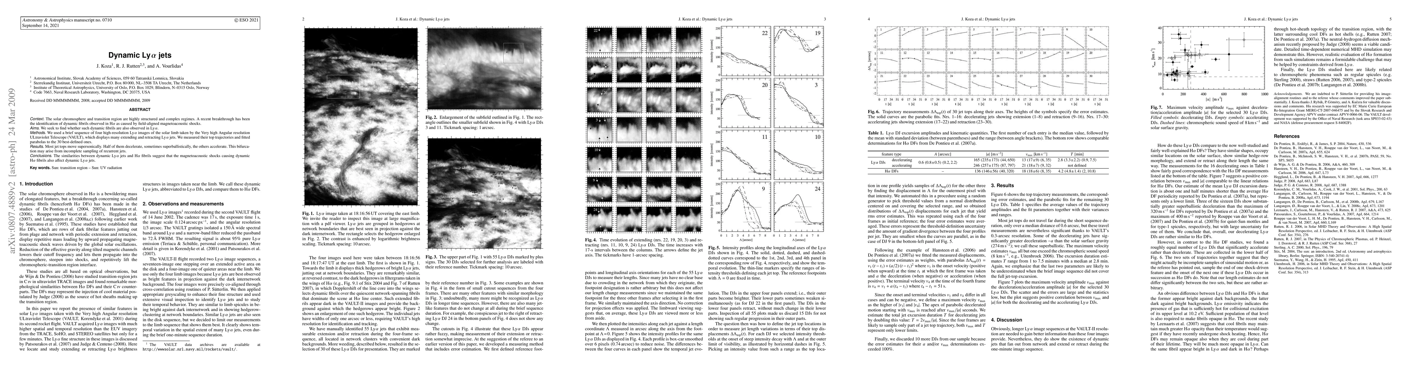 The solar chromosphere and transition region are highly structured and complex regimes. A recent breakthrough has been the identification of dynamic fibrils observed in H alpha as caused by field-aligned magnetoacoustic shocks. We seek to find whether such dynamic fibrils are also observed in Ly alpha. We used a brief sequence of four high-resolution Ly alpha images of the solar limb taken by the Very high Angular resolution ULtraviolet Telescope (VAULT), which displays many extending and retracting Ly alpha jets. We measured their top trajectories and fitted parabolas to the 30 best-defined ones. Most jet tops move supersonically. Half of them decelerate, sometimes superballistically, the others accelerate. This bifurcation may arise from incomplete sampling of recurrent jets. The similarities between dynamic Ly alpha jets and H alpha fibrils suggest that the magnetoacoustic shocks causing dynamic H alpha fibrils also affect dynamic Ly alpha jets.