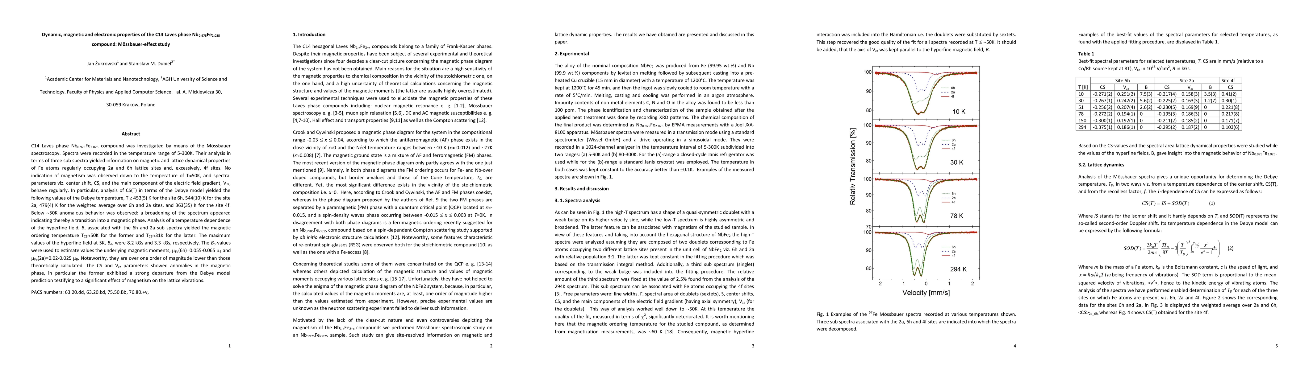 C14 Laves phase Nb0.975Fe2.025 compound was investigated by means of the M\"ossbauer spectroscopy. Spectra were recorded in the temperature range of 5-300K. Their analysis in terms of three sub spectra yielded information on magnetic and lattice dynamical properties of Fe atoms regularly occupying 2a and 6h lattice sites and, excessively, 4f sites. No indication of magnetism was observed down to the temperature of T=ca.50K, and spectral parameters viz. center shift, CS, and the main component of the electric field gradient, Vzz, behave regularly. In particular, analysis of CS(T) in terms of the Debye model yielded the following values of the Debye temperature, T_D: 453(5) K for the site 6h, 544(10) K for the site 2a, 479(4) K for the weighted average over 6h and 2a sites, and 363(35) K for the site 4f. Below ca.50K anomalous behavior was observed: a broadening of the spectrum appeared indicating thereby a transition into a magnetic phase. Analysis of a temperature dependence of the hyperfine field, B, associated with the 6h and 2a sub spectra yielded the magnetic ordering temperature T_C1=ca.50K for the former and T_C2=ca.31K for the latter. The maximum values of the hyperfine field at 5K, Bo, were 8.2 kGs and 3.3 kGs, respectively. The Bo-values were used to estimate values the underlying magnetic moments, m_Fe(6h)=0.055-0.065 Bohr magneton and m_Fe(2a)=0.02-0.025 Bohr magneton. Noteworthy, they are over one order of magnitude lower than those theoretically calculated. The CS and Vzz parameters showed anomalies in the magnetic phase, in particular the former exhibited a strong departure from the Debye model prediction testifying to a significant effect of magnetism on the lattice vibrations.