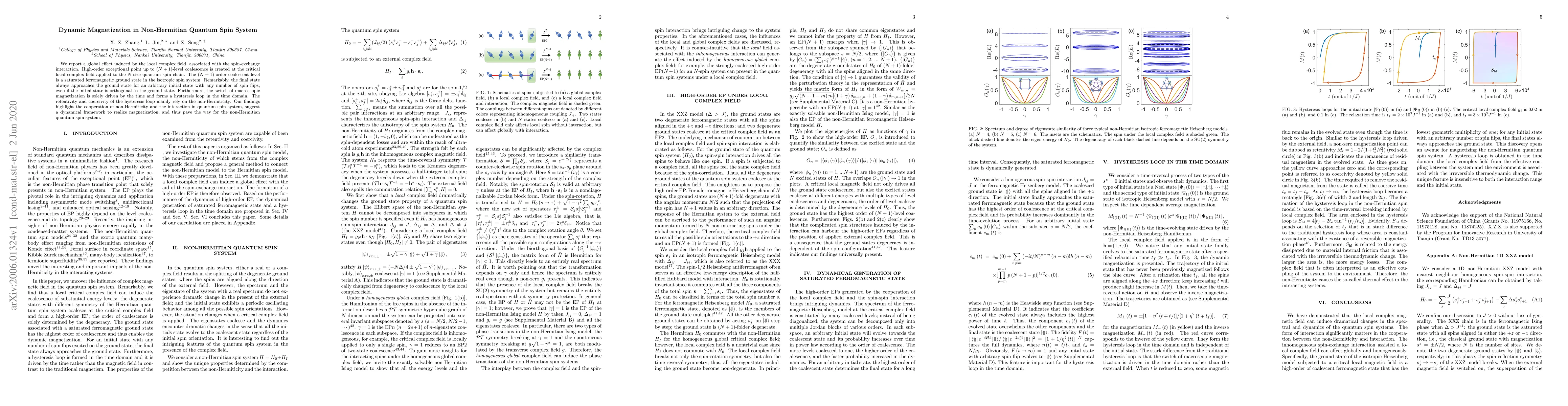 We report a global effect induced by the local complex field, associated with the spin-exchange interaction. High-order exceptional point up to ($N+1$)-level coalescence is created at the critical local complex field applied to the $N$-size quantum spin chain. The ($N+1$)-order coalescent level is a saturated ferromagnetic ground state in the isotropic spin system. Remarkably, the final state always approaches the ground state for an arbitrary initial state with any number of spin flips; even if the initial state is orthogonal to the ground state. Furthermore, the switch of macroscopic magnetization is solely driven by the time and forms a hysteresis loop in the time domain. The retentivity and coercivity of the hysteresis loop mainly rely on the non-Hermiticity. Our findings highlight the cooperation of non-Hermiticity and the interaction in quantum spin system, suggest a dynamical framework to realize magnetization, and thus pave the way for the non-Hermitian quantum spin system.