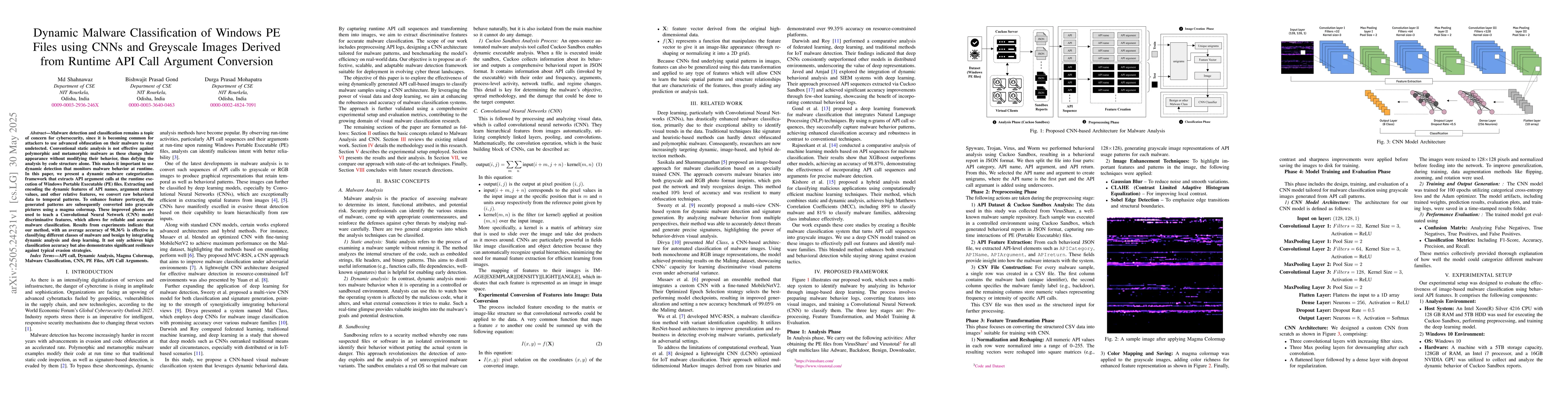 A dynamic malware classification framework uses CNNs to analyze runtime API call data from Windows PE files, achieving 98.36% accuracy in classifying malware and benign software.