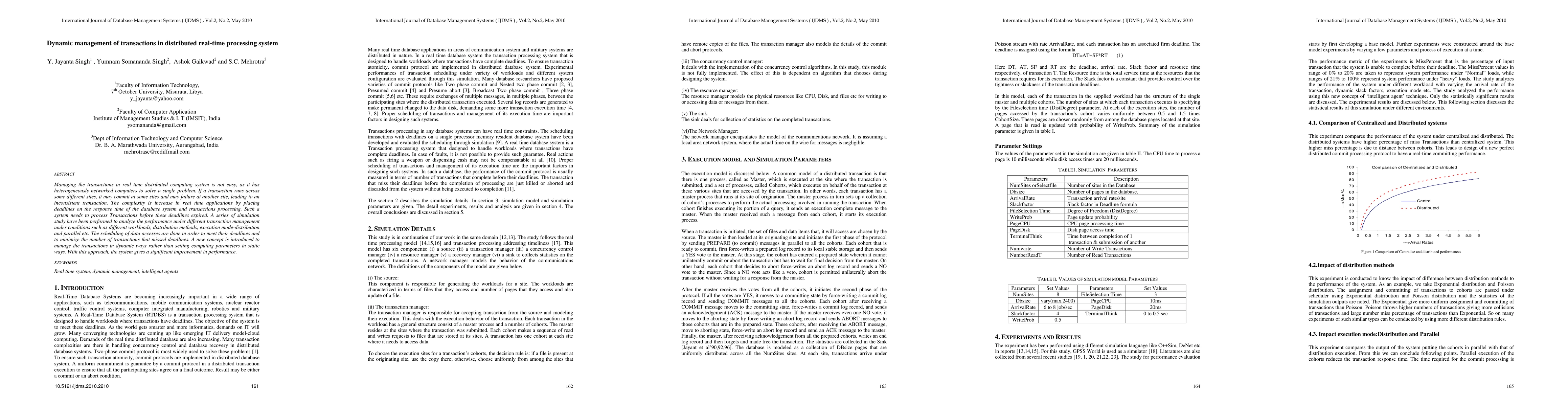 Managing the transactions in real time distributed computing system is not easy, as it has heterogeneously networked computers to solve a single problem. If a transaction runs across some different sites, it may commit at some sites and may failure at another site, leading to an inconsistent transaction. The complexity is increase in real time applications by placing deadlines on the response time of the database system and transactions processing. Such a system needs to process Transactions before these deadlines expired. A series of simulation study have been performed to analyze the performance under different transaction management under conditions such as different workloads, distribution methods, execution mode-distribution and parallel etc. The scheduling of data accesses are done in order to meet their deadlines and to minimize the number of transactions that missed deadlines. A new concept is introduced to manage the transactions in dynamic ways rather than setting computing parameters in static ways. With this approach, the system gives a significant improvement in performance.