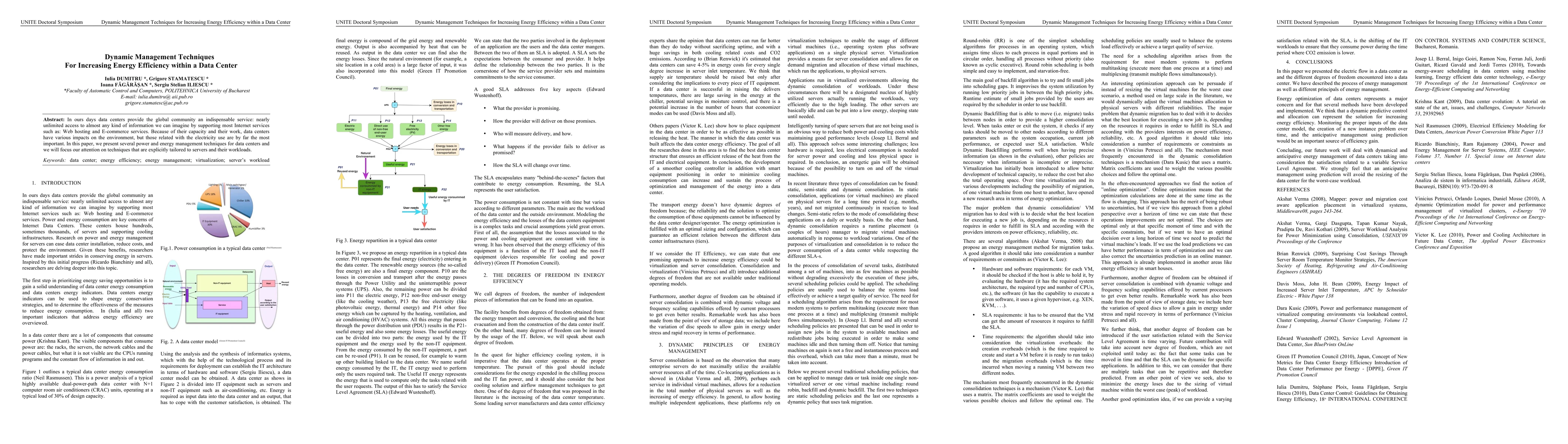 The paper presents various dynamic management techniques for increasing energy efficiency in data centers, focusing on server and workload-specific techniques. It models energy repartition in a typical data center, considering input factors like site location and natural environment, and output factors such as energy losses and heat reuse.