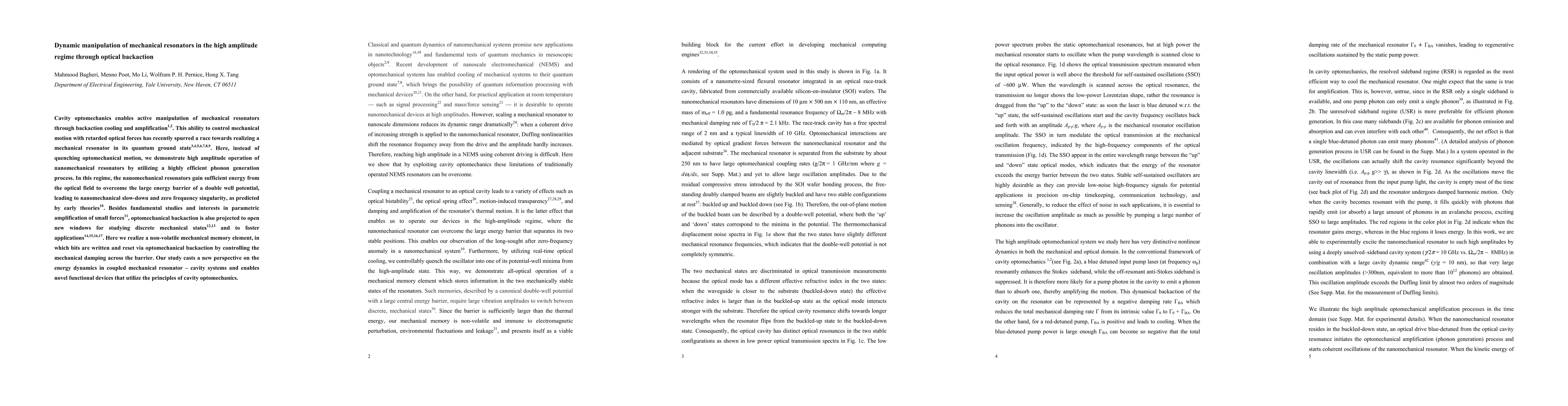 This paper demonstrates high amplitude manipulation of nanomechanical resonators using optical backaction, achieving sufficient energy transfer to overcome double-well potential barriers, leading to a non-volatile mechanical memory element. The study provides new insights into energy dynamics in optomechanical systems and potential applications in discrete mechanical states and functional devices.