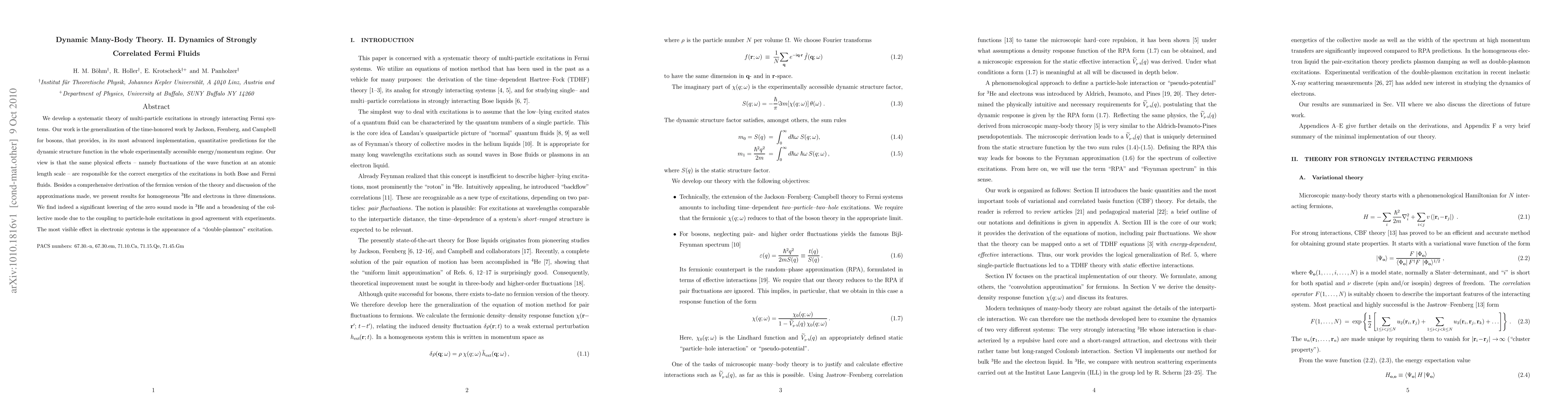 We develop a systematic theory of multi-particle excitations in strongly interacting Fermi systems. Our work is the generalization of the time-honored work by Jackson, Feenberg, and Campbell for bosons, that provides, in its most advanced implementation, quantitative predictions for the dynamic structure function in the whole experimentally accessible energy/momentum regime. Our view is that the same physical effects -- namely fluctuations of the wave function at an atomic length scale -- are responsible for the correct energetics of the excitations in both Bose and Fermi fluids. Besides a comprehensive derivation of the fermion version of the theory and discussion of the approximations made, we present results for homogeneous He-3 and electrons in three dimensions. We find indeed a significant lowering of the zero sound mode in He-3 and a broadening of the collective mode due to the coupling to particle-hole excitations in good agreement with experiments. The most visible effect in electronic systems is the appearance of a ``double-plasmon'' excitation.