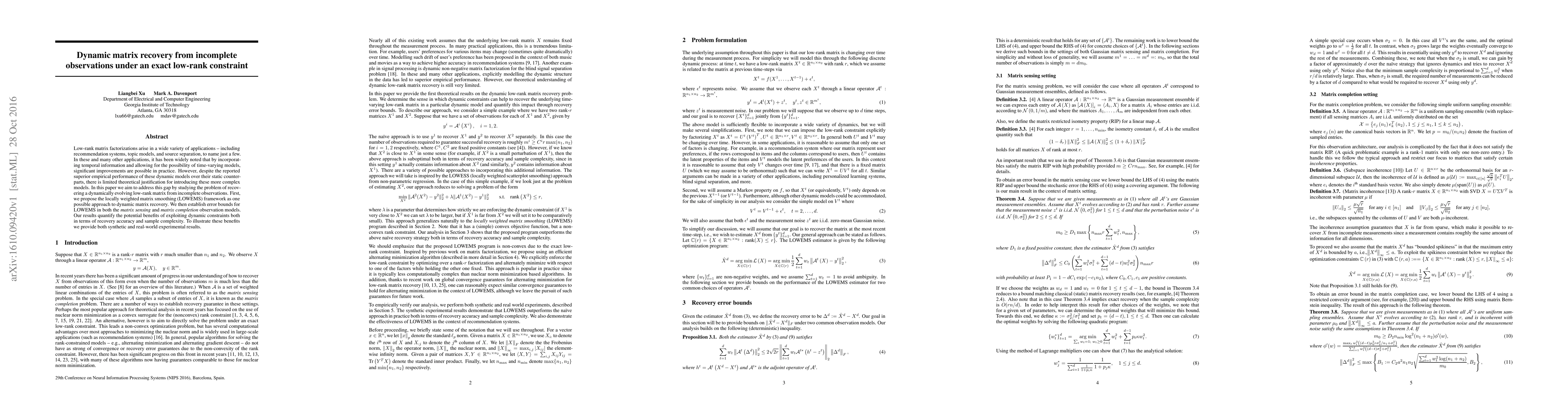 This paper proposes the LOWEMS framework for dynamic matrix recovery under an exact low-rank constraint, establishing error bounds for its performance in matrix sensing and completion. It demonstrates theoretical benefits of dynamic models over static ones in both accuracy and sample complexity through synthetic and real-world experiments.